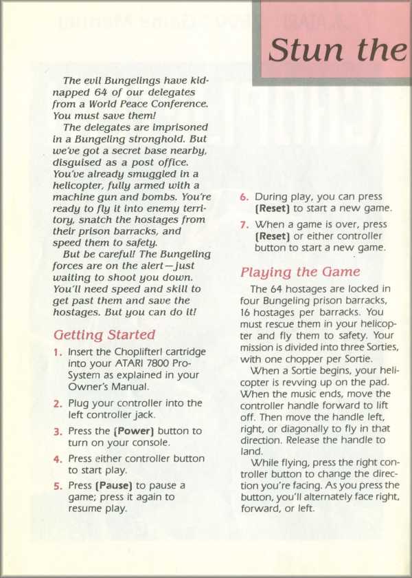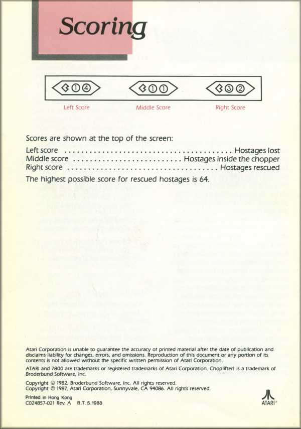 Choplifter! Manual B ©1987, white, C024857-021 on back, 4 pages, 5 x 7”, Printed in Hong Kong, Rev A, “B.T.5.1988” right of product number