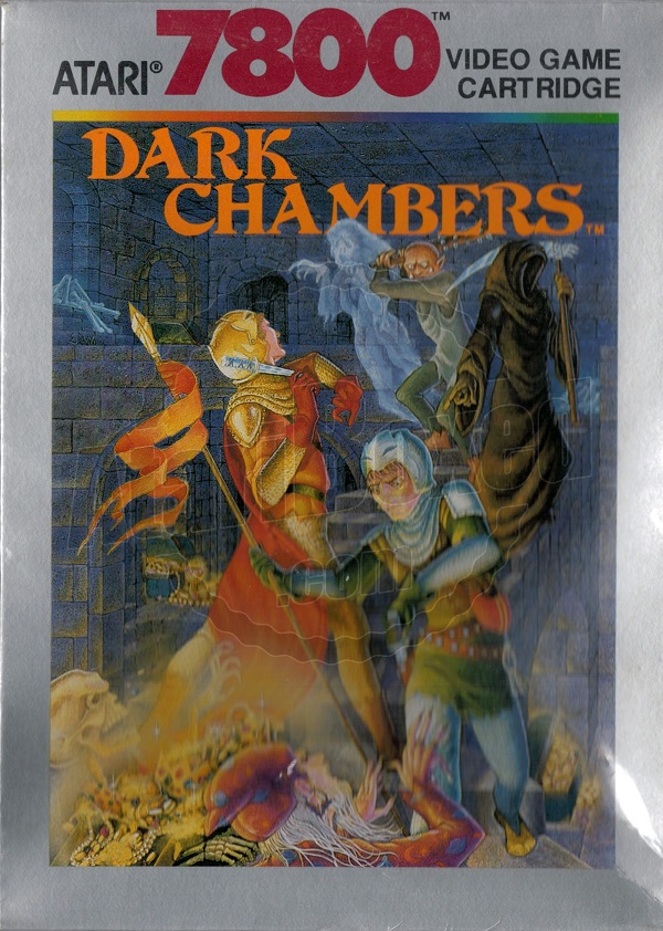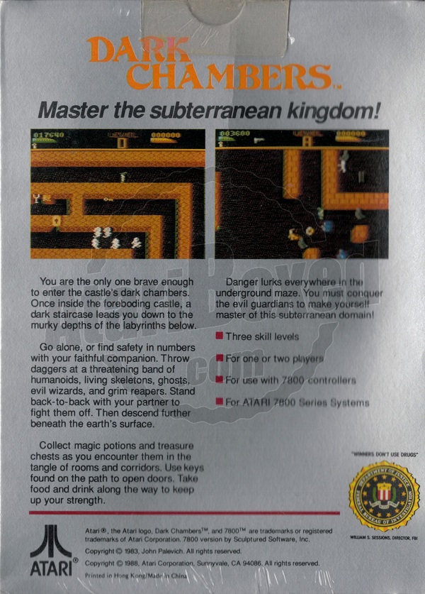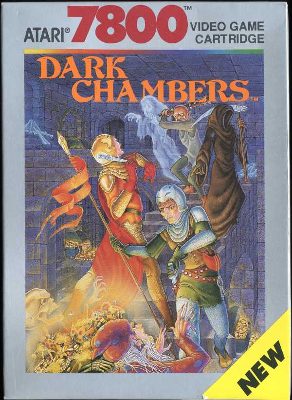Dark Chambers Boxes 1) ©1988, grey box, “New” sticker in lower right corner, Printed in Hong Kong/Made in China, standard flap style box Front
