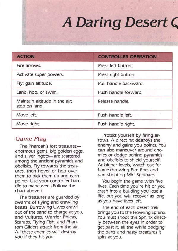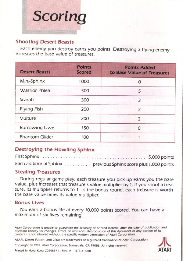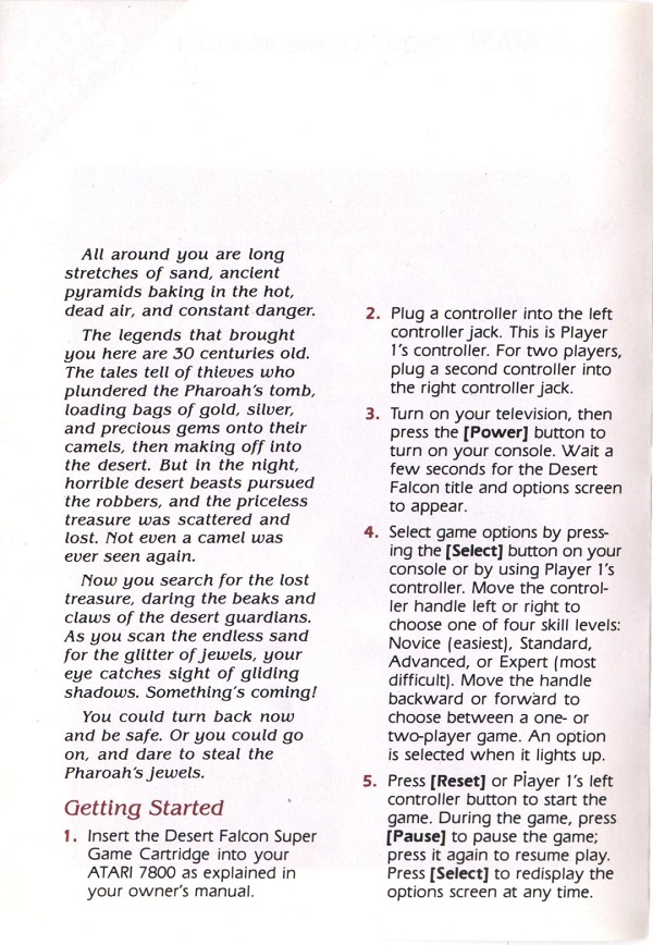 Desert Falcon Manual A ©1987, white, C024857-011 on back, 8 pages, 5 x 7”, Printed in Hong Kong, Rev A, “B.T.5.1988” right of product number