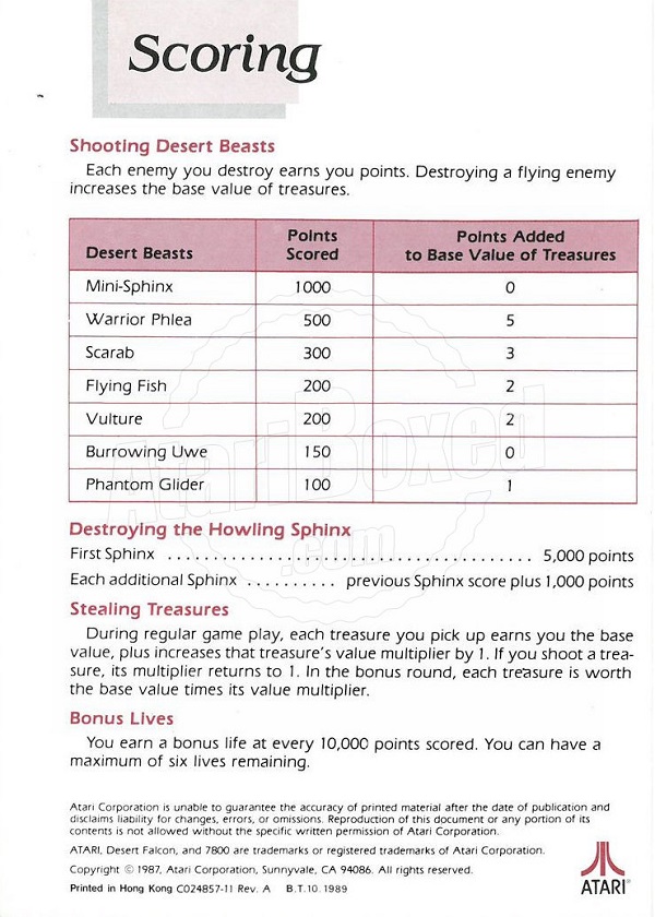 Desert Falcon Manual B ©1987, white, C024857-011 on back, 8 pages, 5 x 7”, Printed in Hong Kong, Rev A, “B.T.10.1989” right of product number