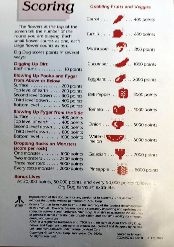 Dig Dug Manual B ©1987, white, CO24857-03 on back, 4 pages, 5 x 7”, Printed in Taiwan, Rev B, “K.I.2.1987” right of product number