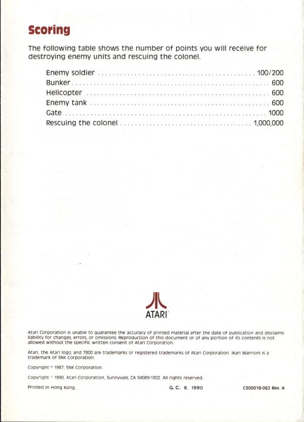 Ikari Warriors Manual B ©1990, white, C300018-062 on back, 6 pages, 5 x 7”, Printed in Hong Kong, Rev A, “G.C.8.1990” left of product number
