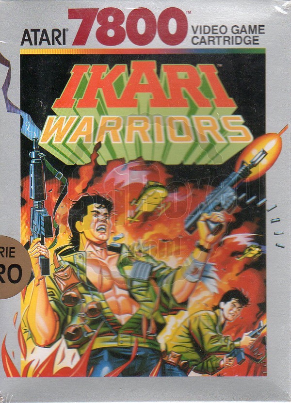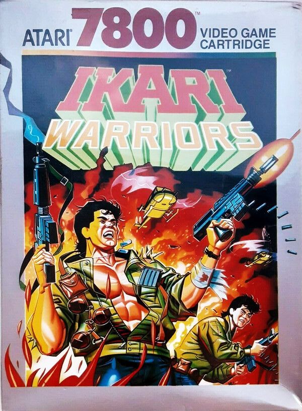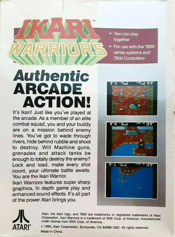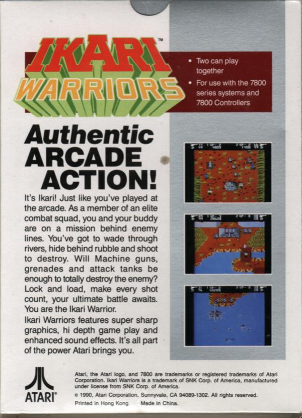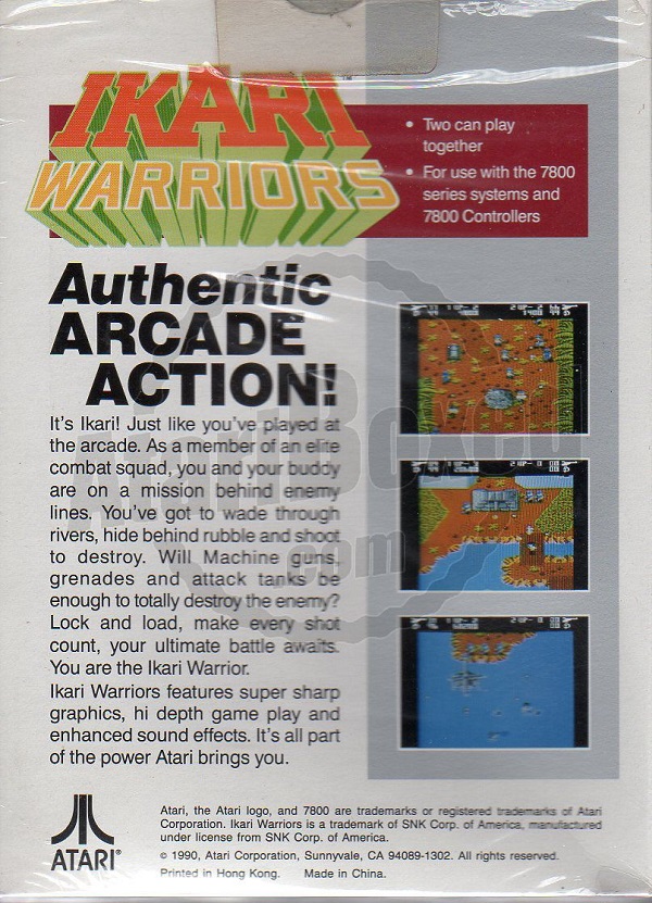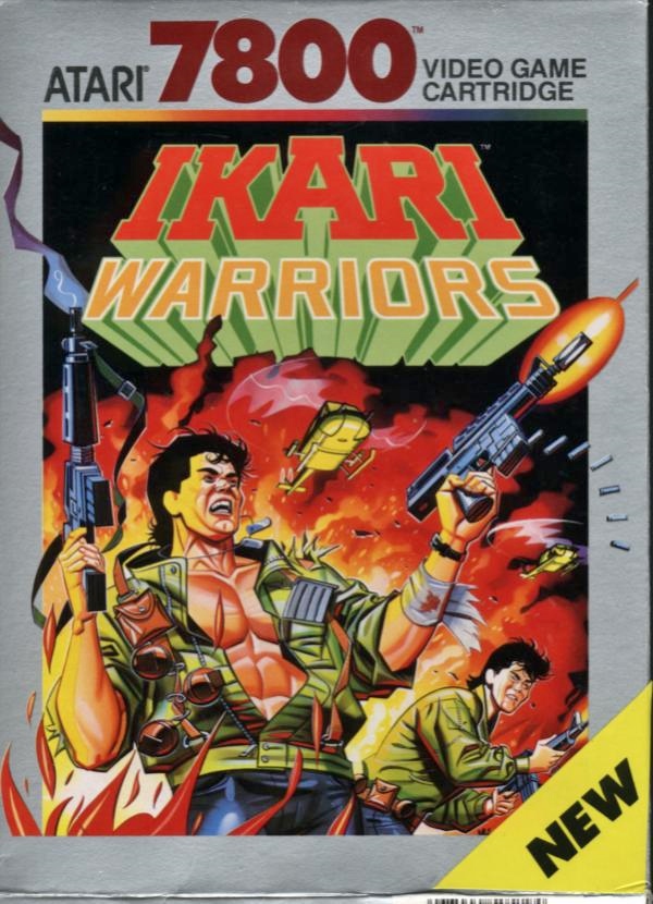 Ikari Warriors Boxes 1) ©1990, grey box, “New” sticker in lower right corner, Printed in Hong Kong. Made in China., standard flap style box Front