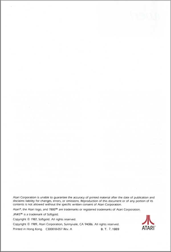 Jinks Manual A ©1989, white, C300018-057 on back, 4 pages, 5 x 7”, Printed in Hong Kong, Rev A, “B.T.7.1989” right of product number