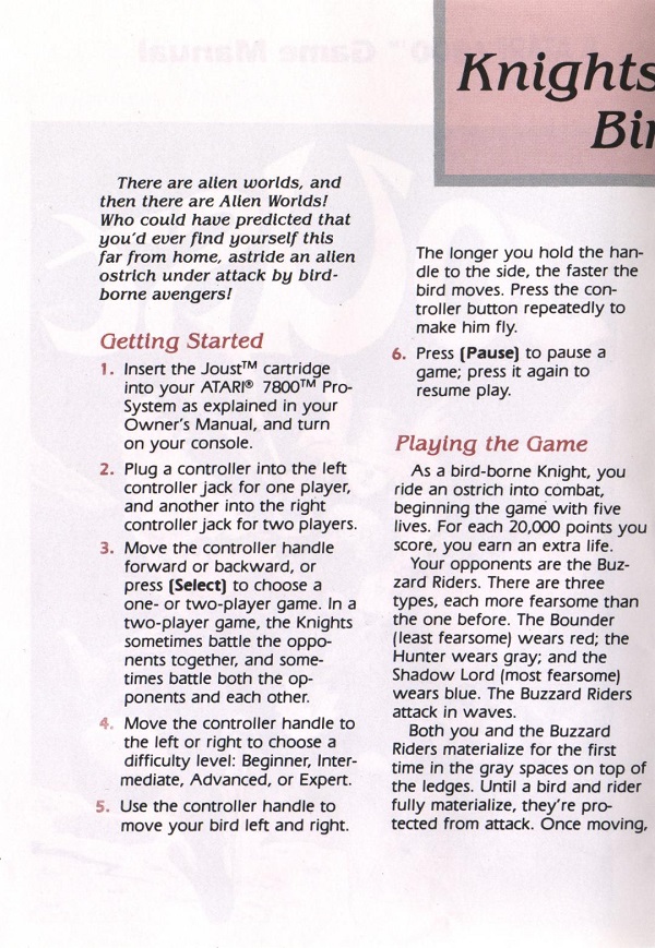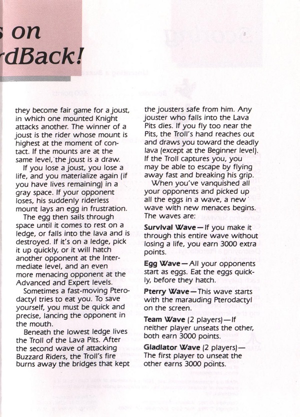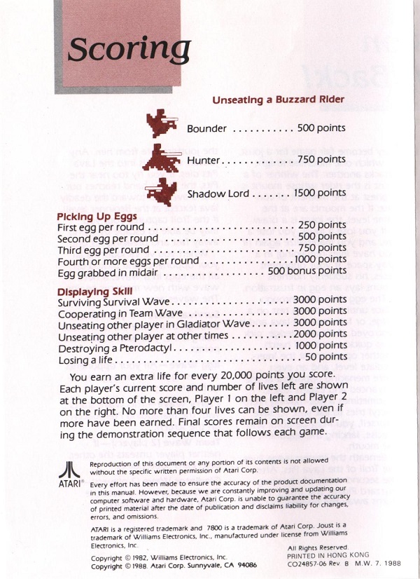 Joust Manual B ©1988, white, CO24857-06 on back, 4 pages, 5 x 7”, Printed in Hong Kong, Rev B, “M.W.7.1988” right of product number
