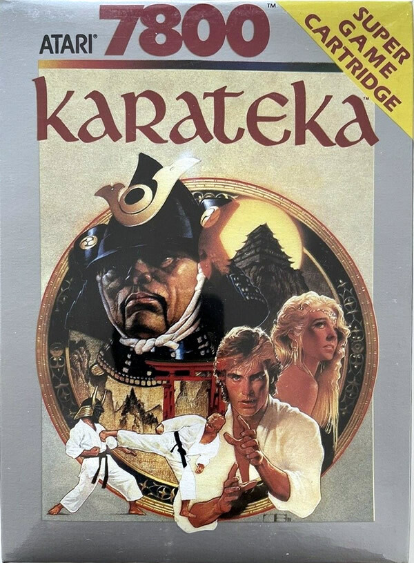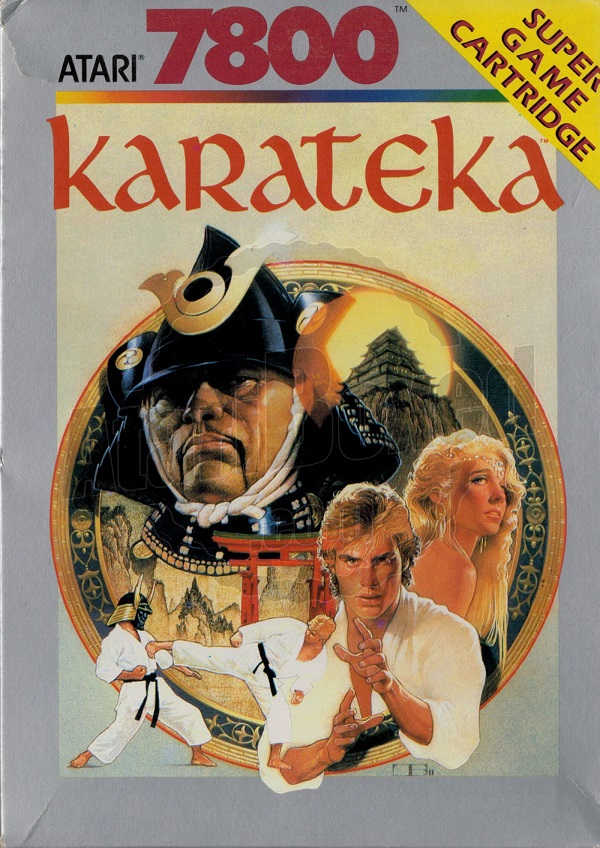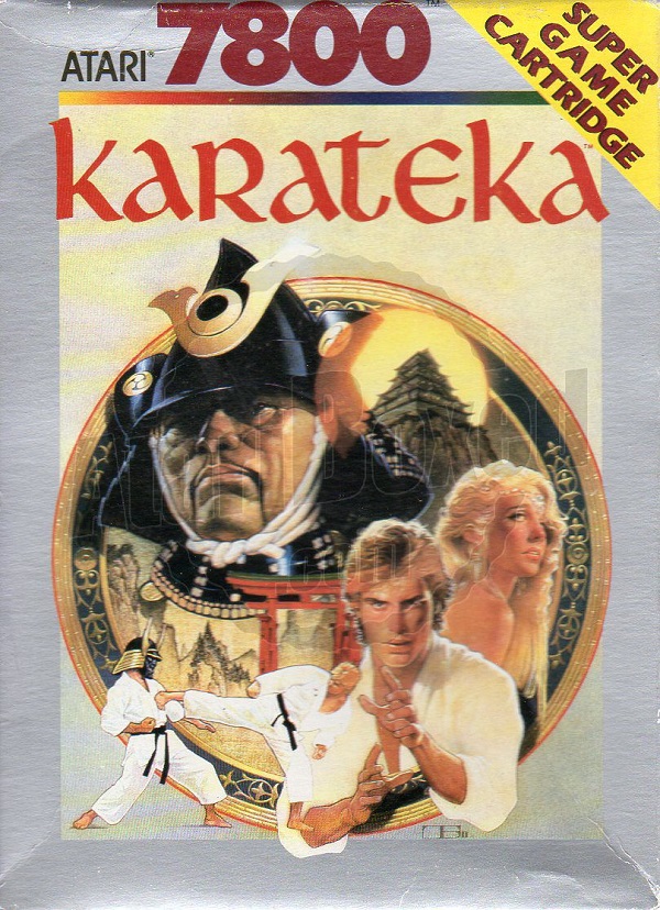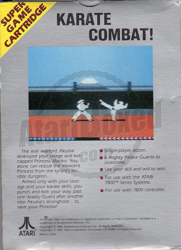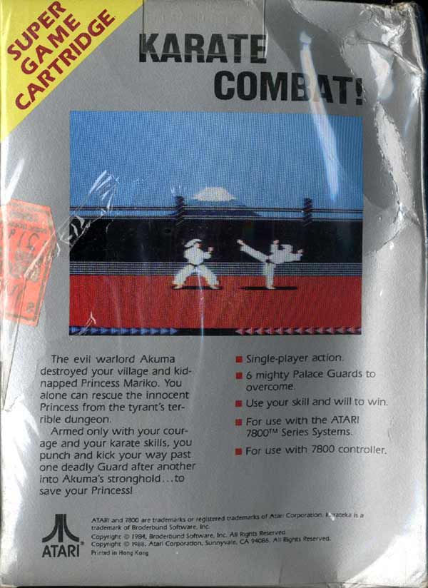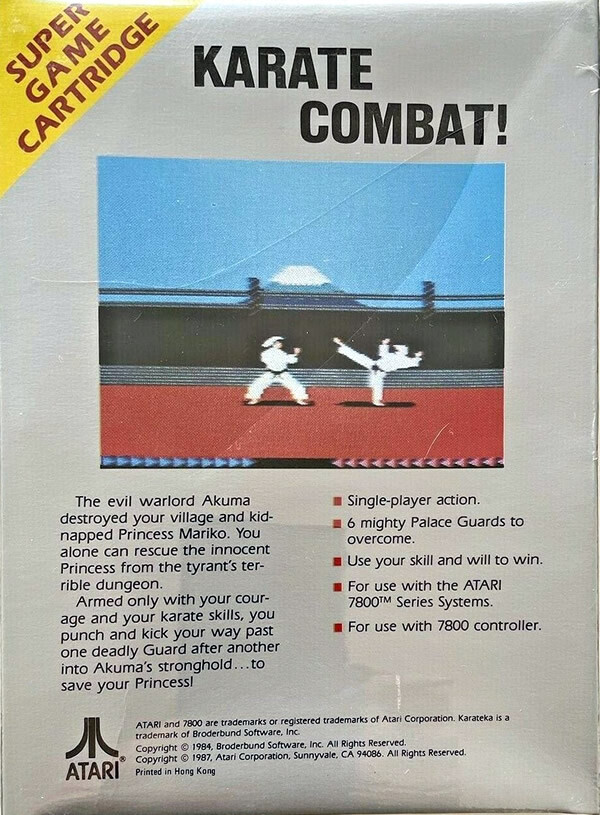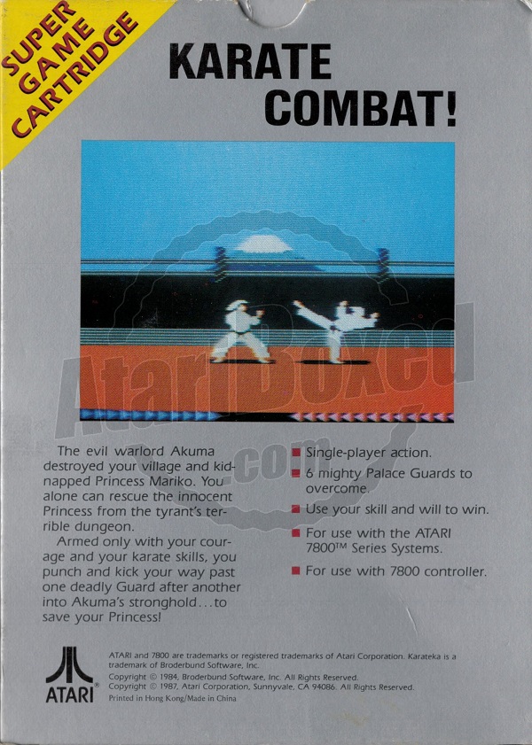 Karateka Boxes 1) ©1987, grey box, Printed in Hong Kong/Made in China, standard flap style box Front
