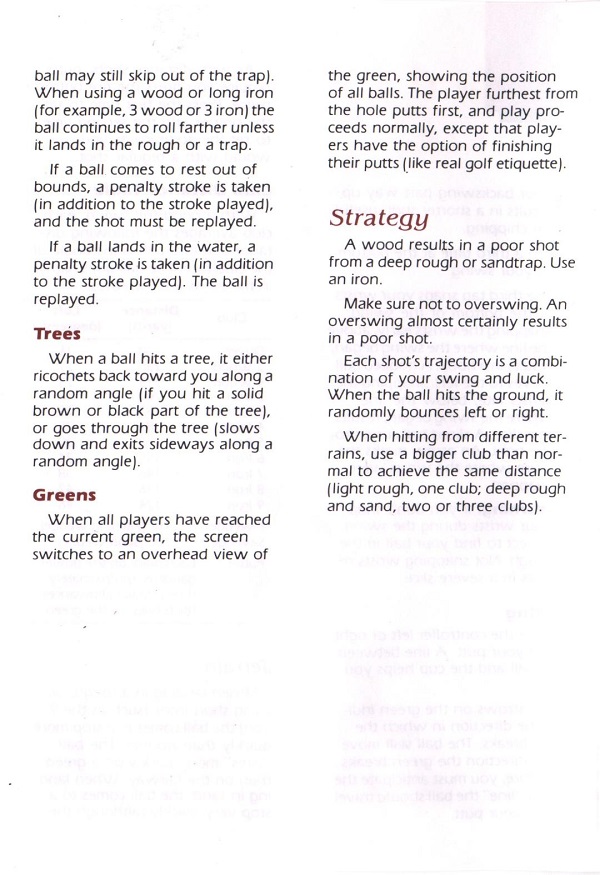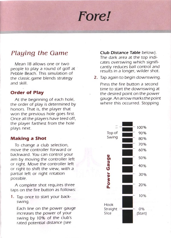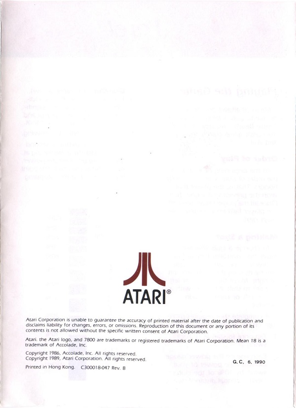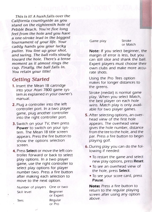Mean 18 Ultimate Golf Manual A ©1989, white, C300018-047 on back, 6 pages, 5 x 7”, Printed in Hong Kong, Rev B, “G.C.6.1990” right of product number