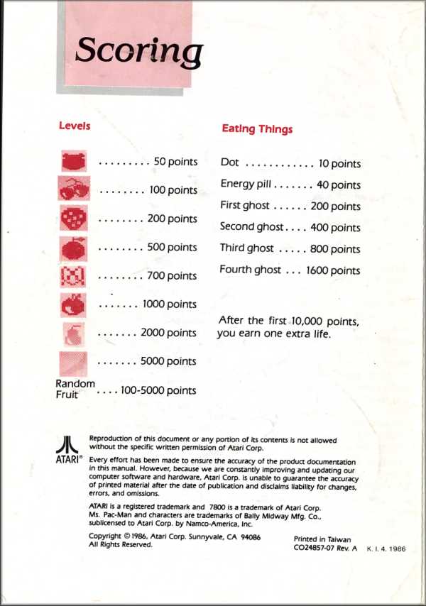 Ms. Pac-Man Manual A ©1986, white, CO24857-07 on back, 4 pages, 5 x 7”, Printed in Taiwan, Rev A, “K.I.4.1986” left of product number