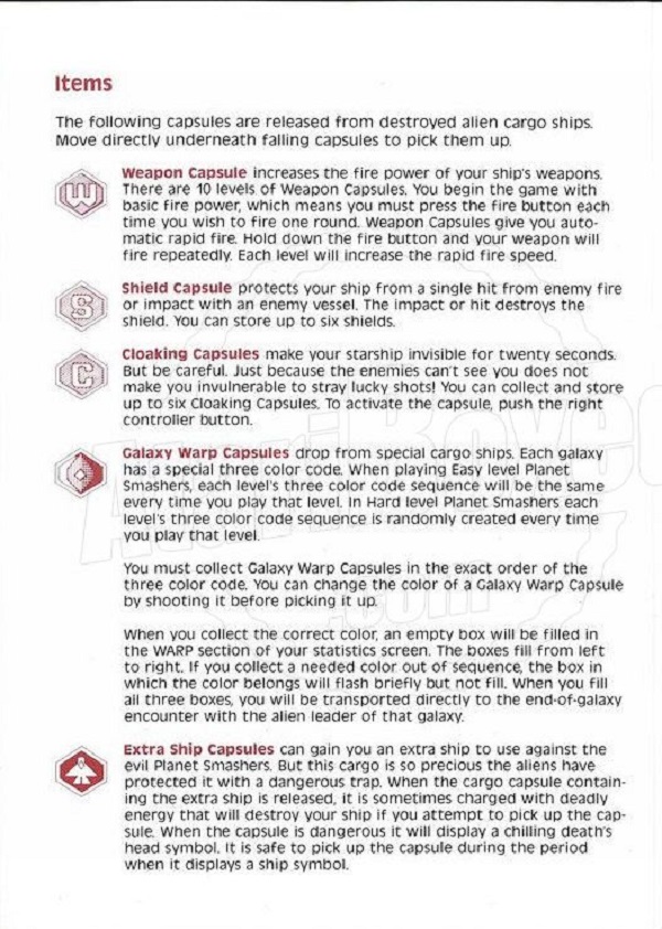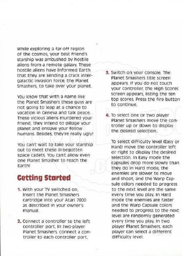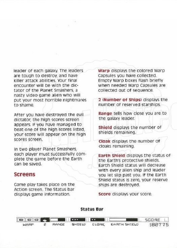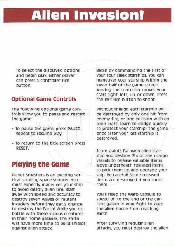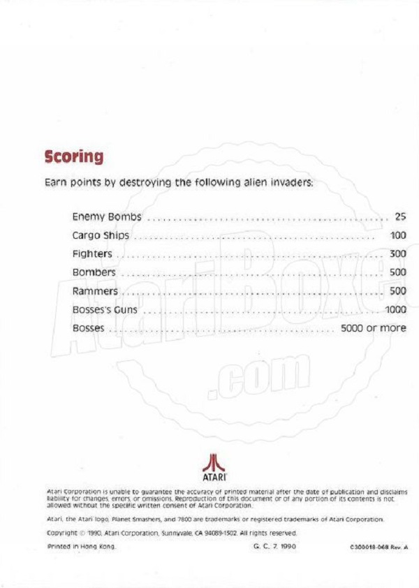 Planet Smashers Manual A ©1990, white, C300018-068 on back, 10 pages, 5 x 7”, Printed in Hong Kong, Rev A, “G.C.7.1990” left of product number