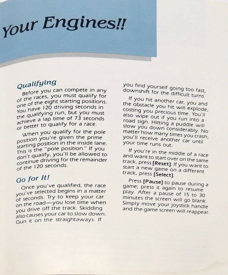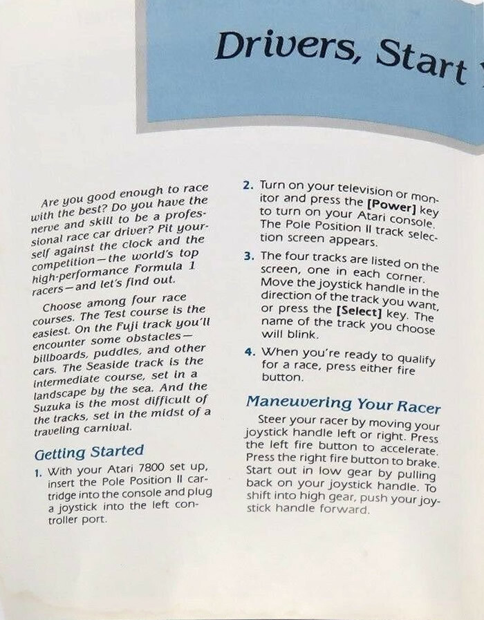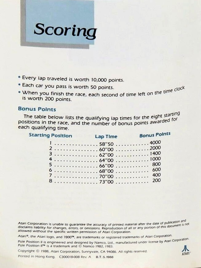 Pole Position II Manual G ©1988, white, blue letters, CO24857-08 on back, 4 pages, 5 x 7”, Printed in Hong Kong, Rev A, “B.T.5.1988” right of product number