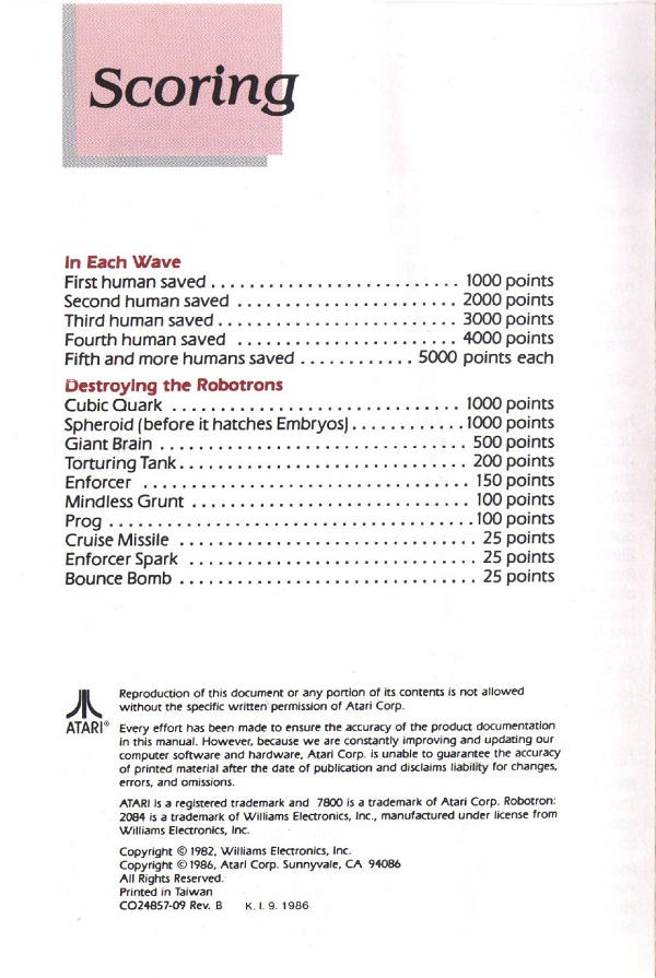 Robotron: 2084 Manual B ©1986, white, CO24857-009 on back, 4 pages, 5 x 7”, Printed in Taiwan, Rev B, “K.I.9.1986” right of product number