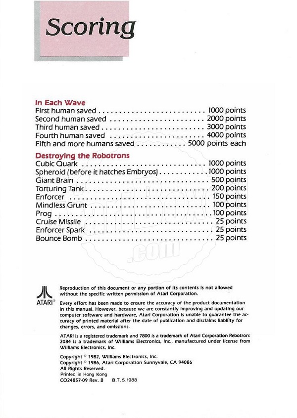 Robotron: 2084 Manual C ©1986, white, CO24857-009 on back, 4 pages, 5 x 7”, Printed in Hong Kong, Rev B, “B.T.5.1988” right of product number