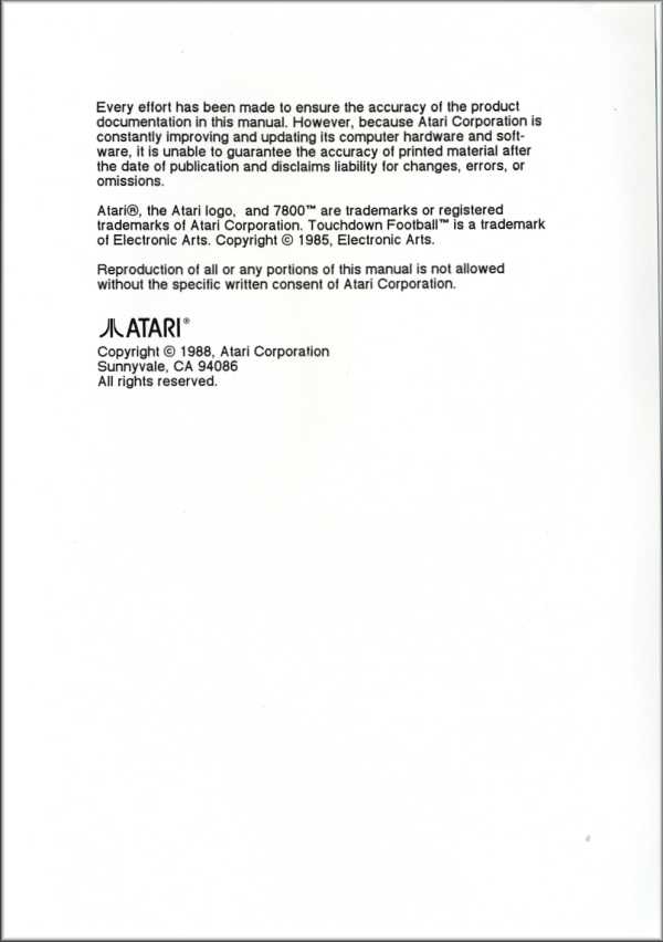 Touchdown Football Manual A ©1988, white, C300018-023 on back, 14 pages, 5 x 7”, Printed in Hong Kong, Rev A, “B.T.1.1989” left of product number
