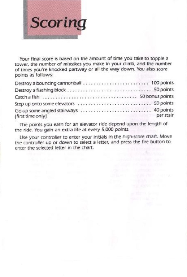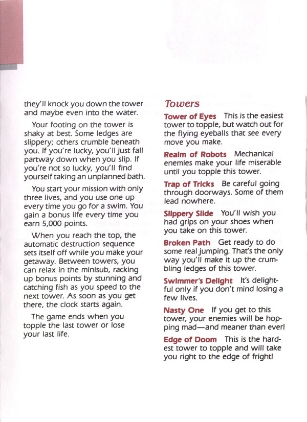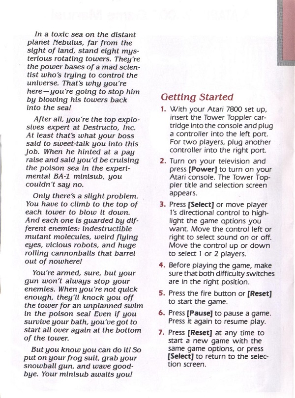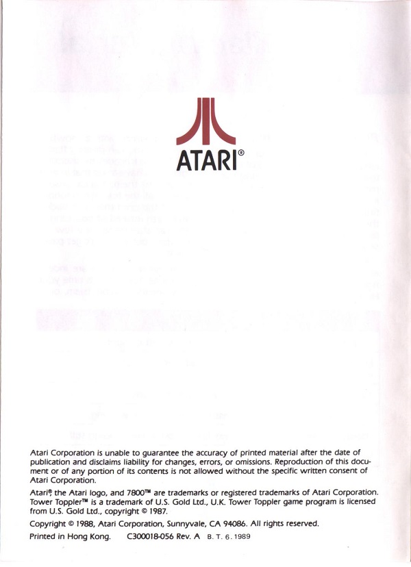 Tower Toppler Manual B ©1988, white, C300018-056 on back, 6 pages, 5 x 7”, Printed in Hong Kong, Rev A, “B.T.6.1989” right of product number