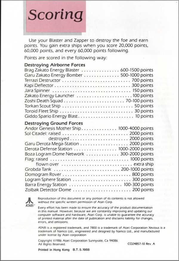 Xevious Manual A ©1986, white, CO24857-10 on back, 4 pages, 5 x 7”, Printed in Hong Kong, Rev A, “B.T.5.1988” left of product number