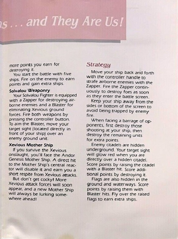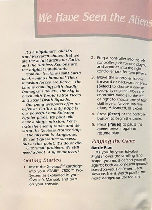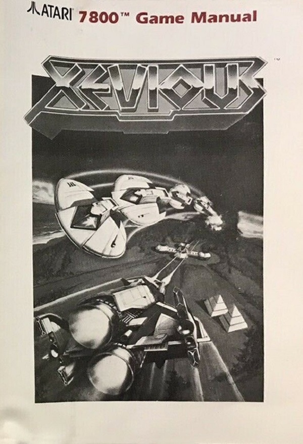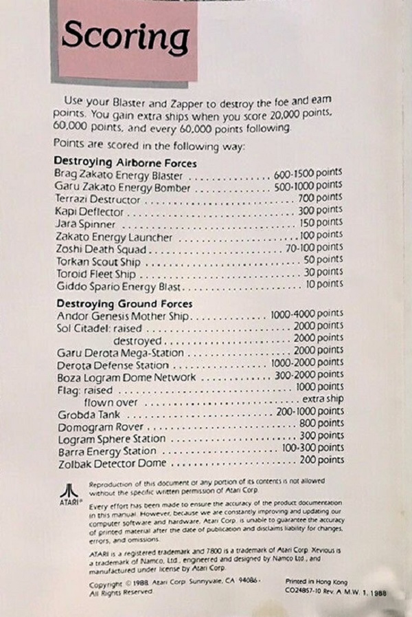 Xevious Manual C ©1988, white, CO24857-10 on back, 4 pages, 5 x 7”, Printed in Hong Kong, Rev A, “M.W.1.1988” right of product number