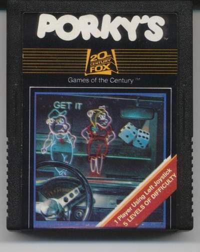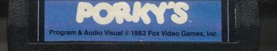 Porky's Cartridges version a) ©1983, black label, purple border, drawn picture, CART: Fox logo, EL: ©1983 Fox Video Games version b) ©1983, black label, purple border, drawn picture, CART: no Fox logo, EL: ©1983 Fox Video Games *Note: The variation on these two is on the mold on the back of the cartridge. See mold variation