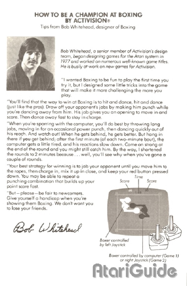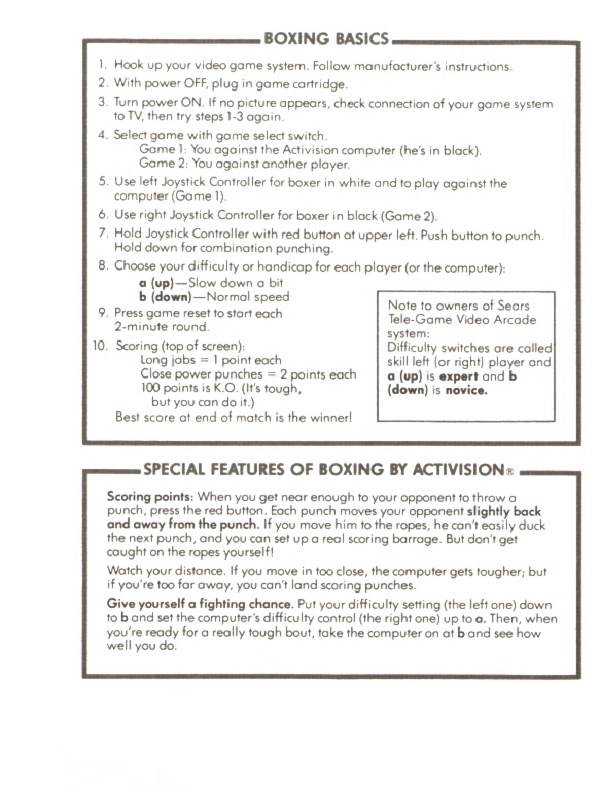 Boxing Manual F ©1980, white, AG-002-03 on back, 4 pages, size?, Printed in USA, Rev 2, b&w cover and contents, no “Look for more Activision…” on back, small 2 line Atari copyright info on back, Mountain View address