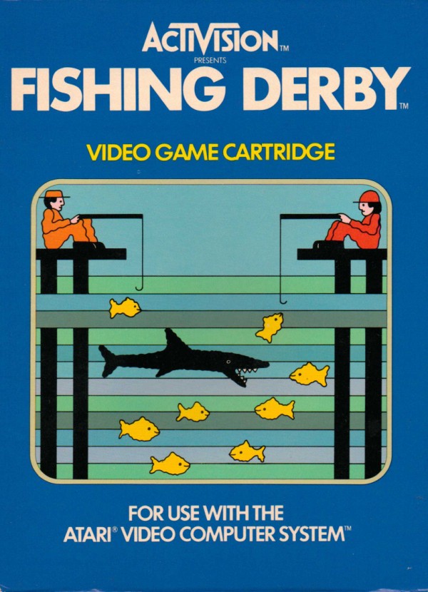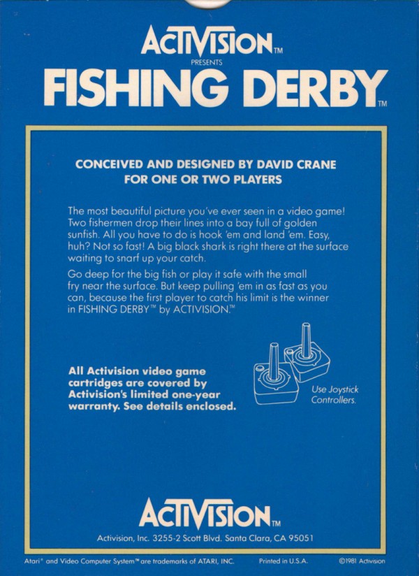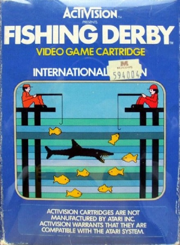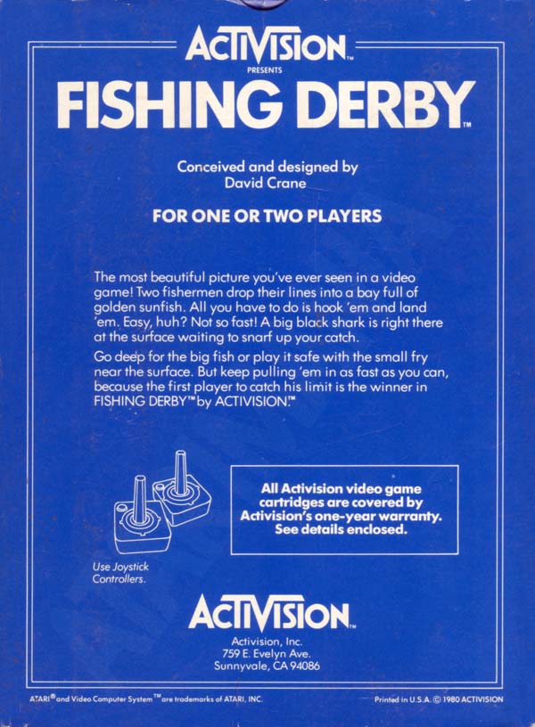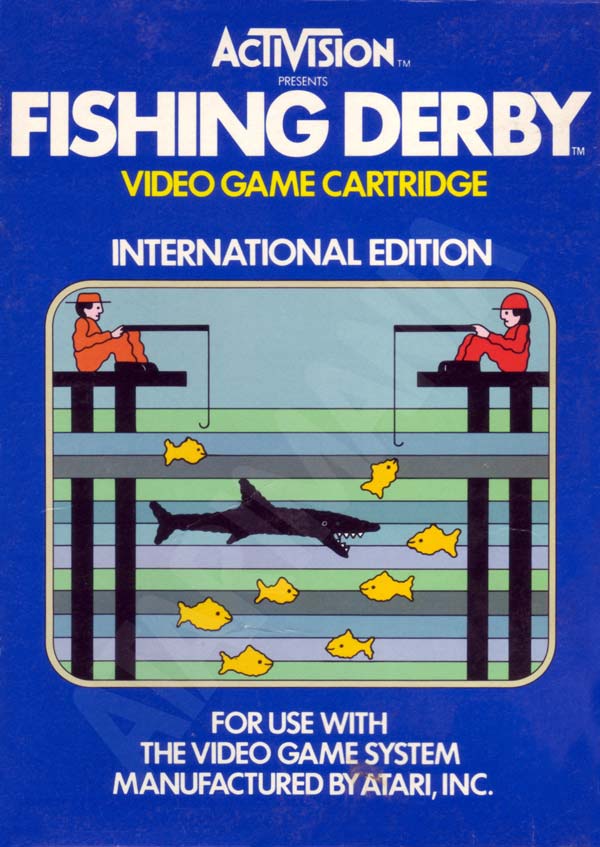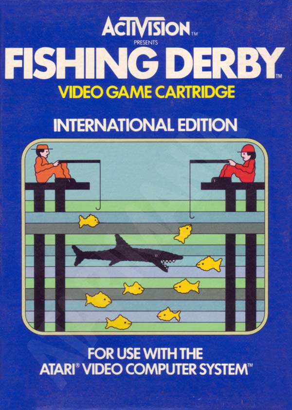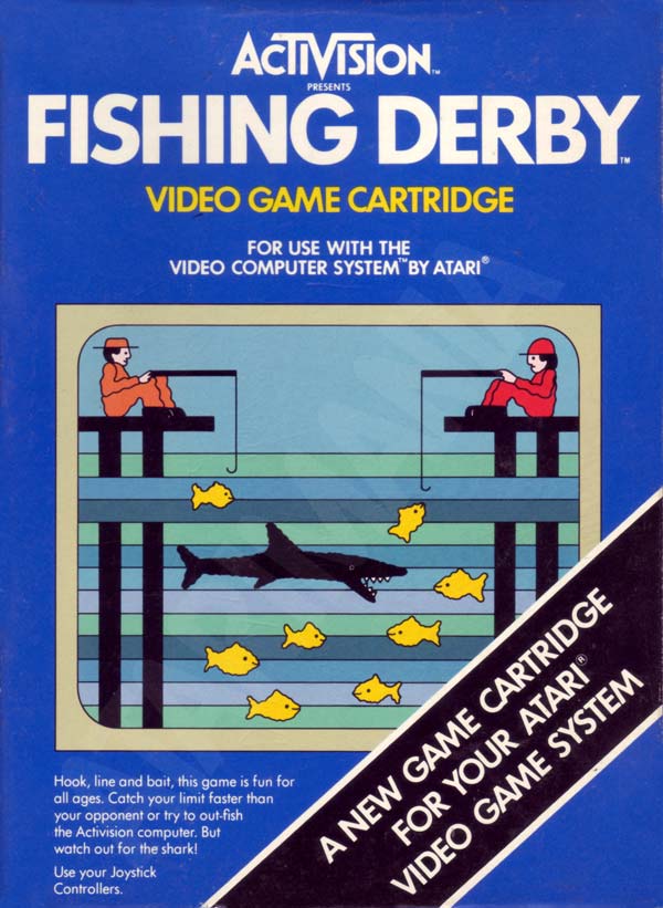 Fishing Derby Boxes 1) ©1980, blue box, “A new game cartridge for your Atari video game system”, Printed in USA, Sunnyvale address on back, no Rev, “SUS” 5/80 (month written), 2/81 on tiny flap Front