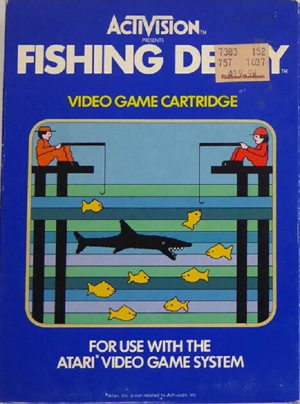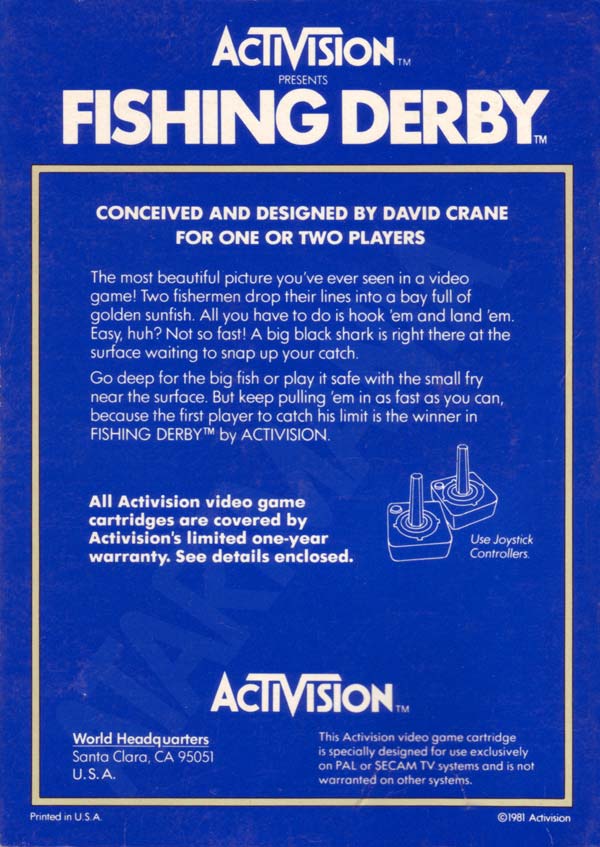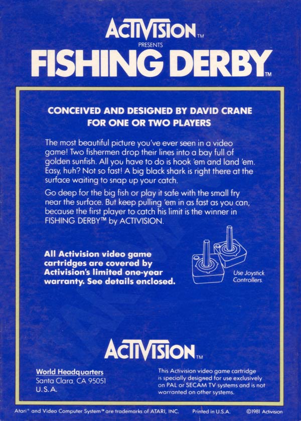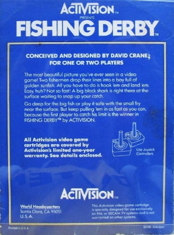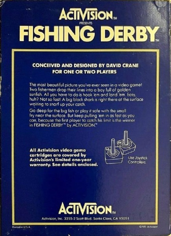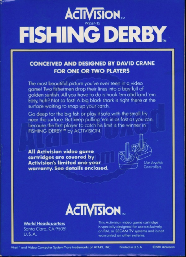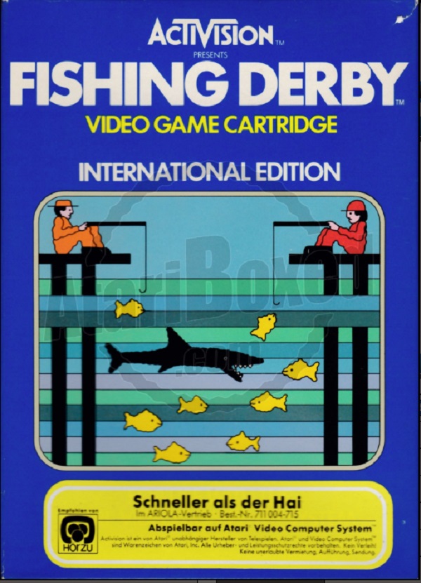 Fishing Derby Boxes 1) ©1980, blue box, “A new game cartridge for your Atari video game system”, Printed in USA, Sunnyvale address on back, no Rev, “SUS” 5/80 (month written), 2/81 on tiny flap Front