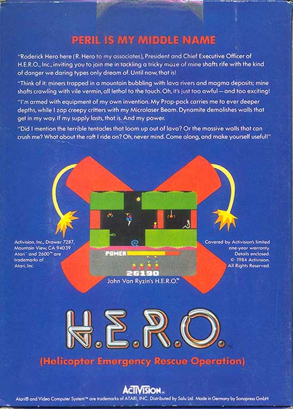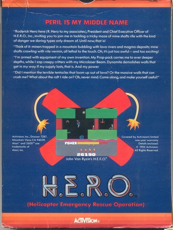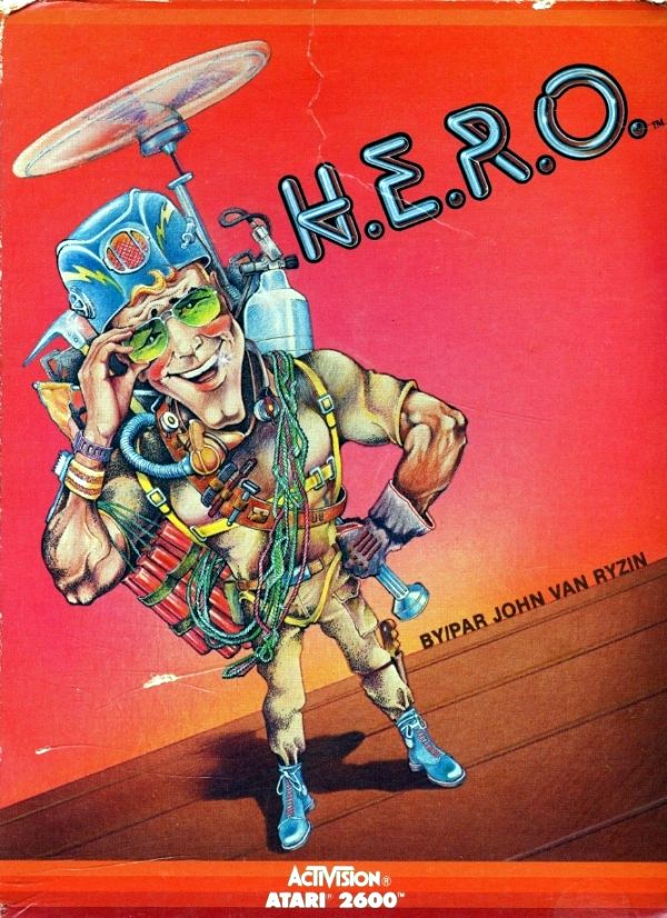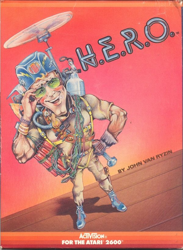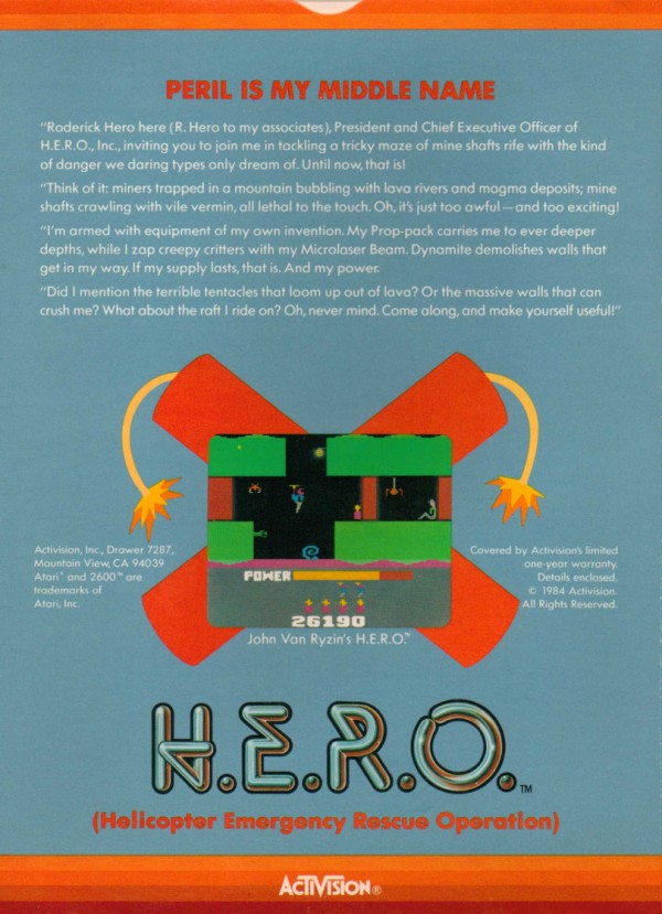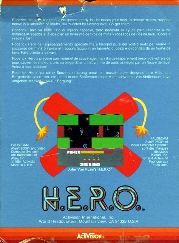 | H.E.R.O. Boxes 1) ©1984, art drawn box, Made in USA on flap, “For the Atari 2600” on bottom front, back of box is dark blue, no Rev, no printer Front