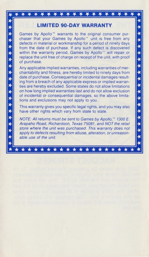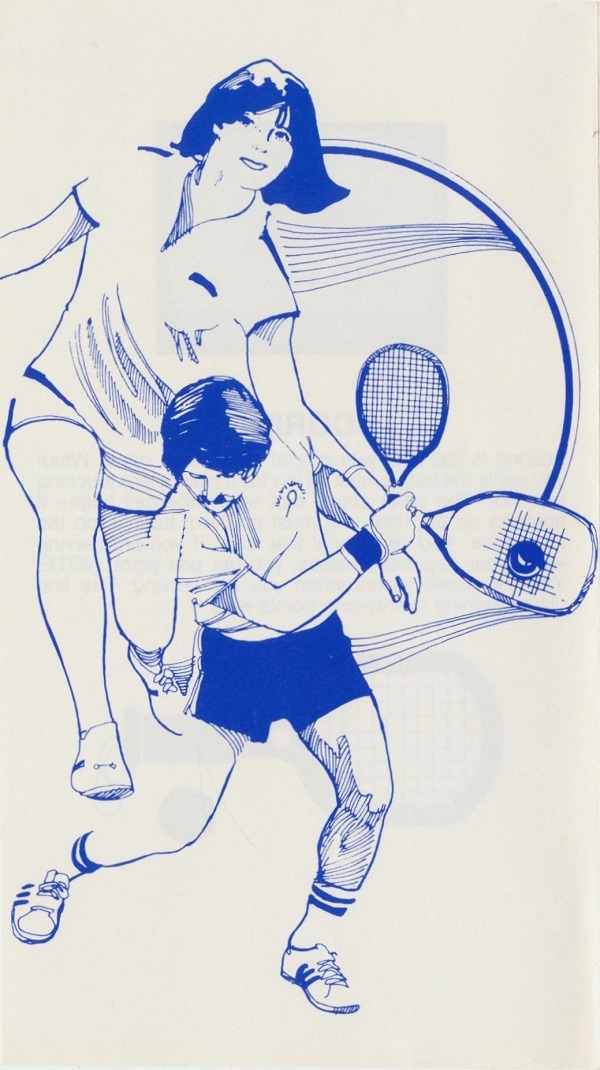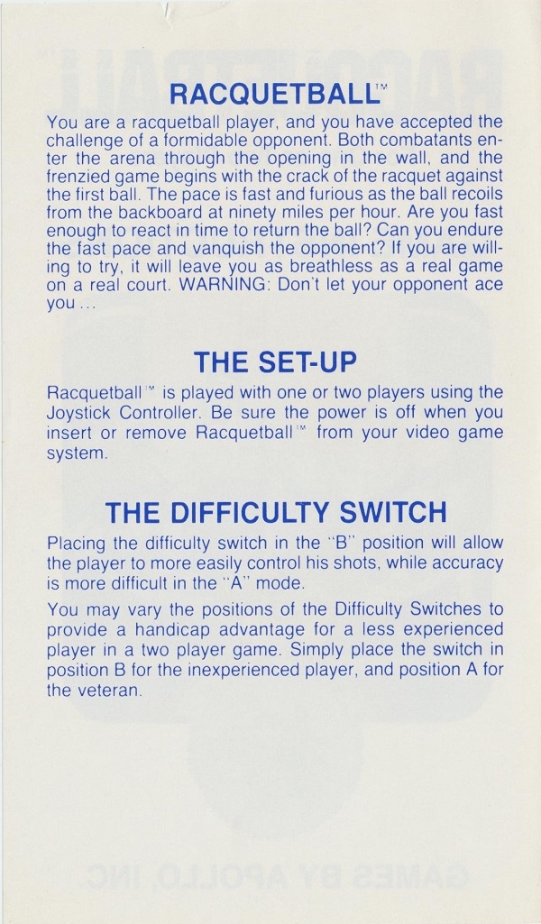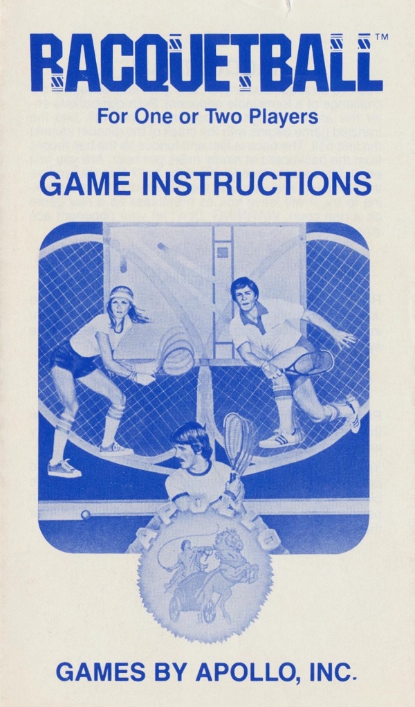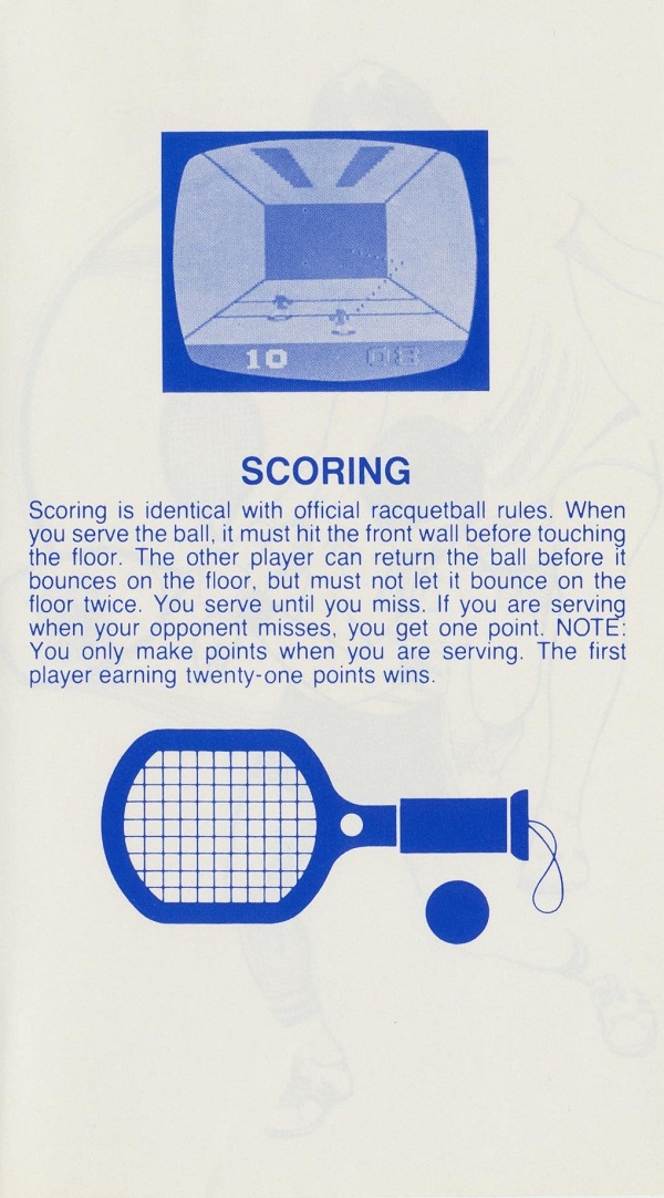 Racquetball Manual B no ©, white (stick letters), no product #, 6 pages (folds out), 3.675 x 6.125”