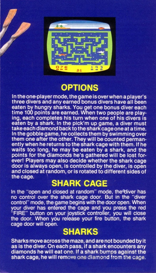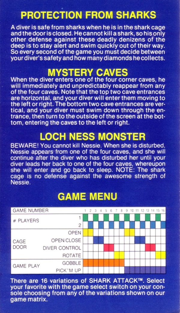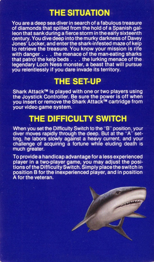 Shark Attack Manual A ©1982, blue (fancy letters), no product #, 6 pages (folds out), size?”