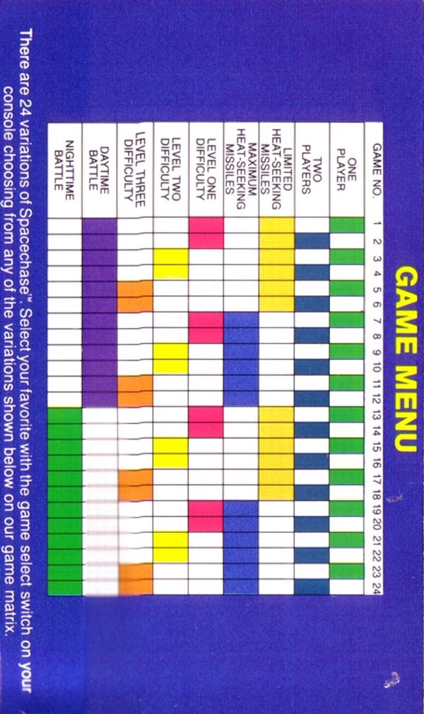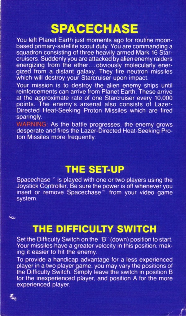 Spacechase Manual B ©1982, dark blue (stick letters), no product #, 6 pages (folds out), size?”