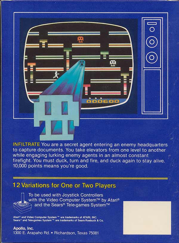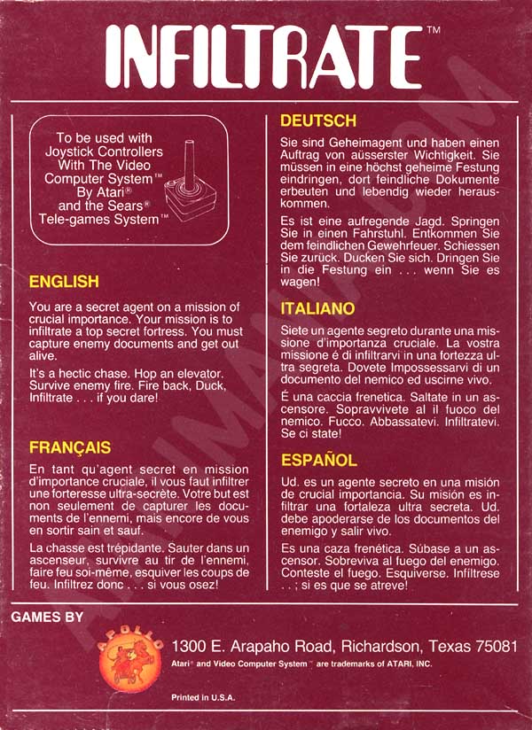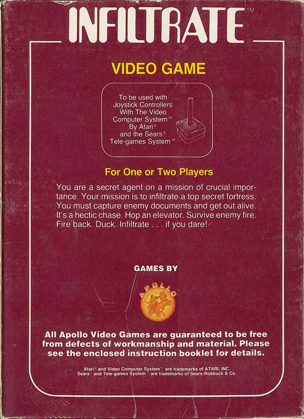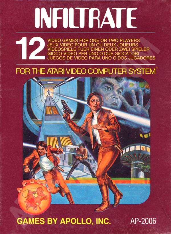 Infiltrate Boxes 1) no ©, maroon box with fancy letters, illustration same as fancy label version, Apollo address on front Front