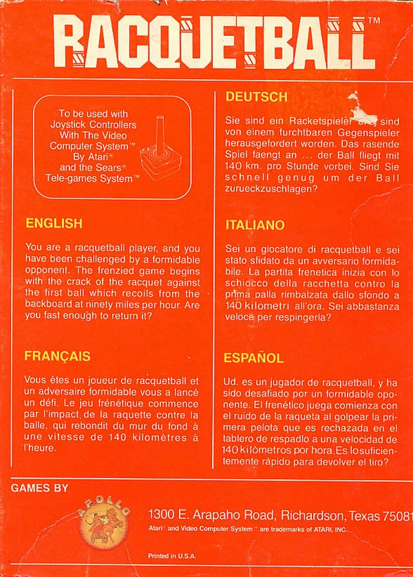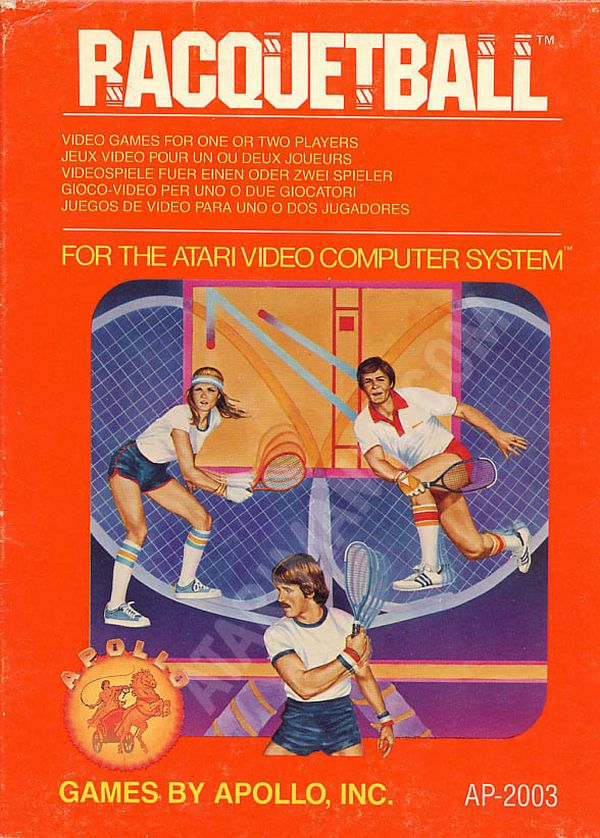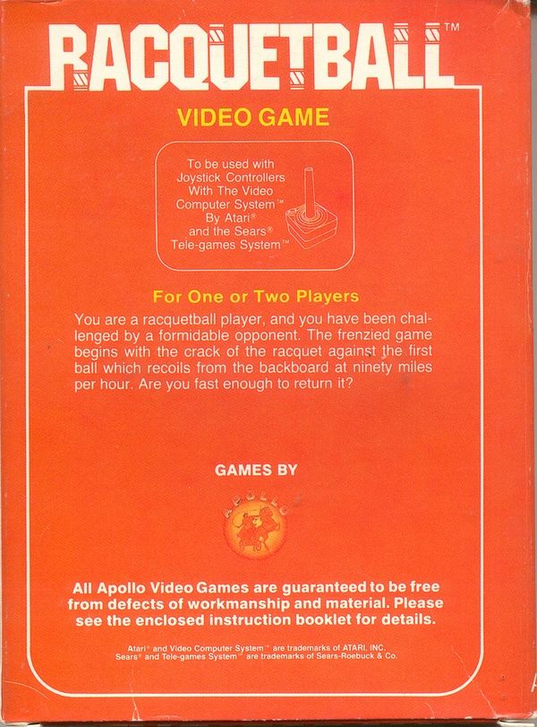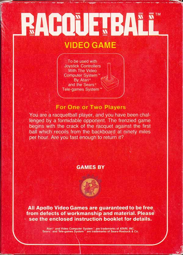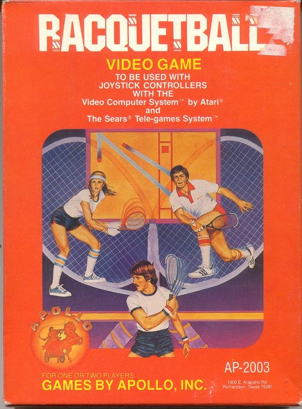 Racquetball Boxes 1) no ©, red box with fancy letters, illustration same as label, Apollo address on front, “For One or Two Players” partially inside Apollo logo, Apollo logo on front and back in red letters Front