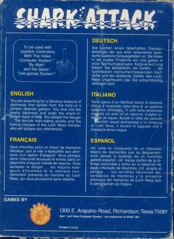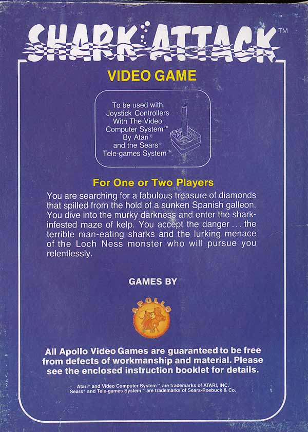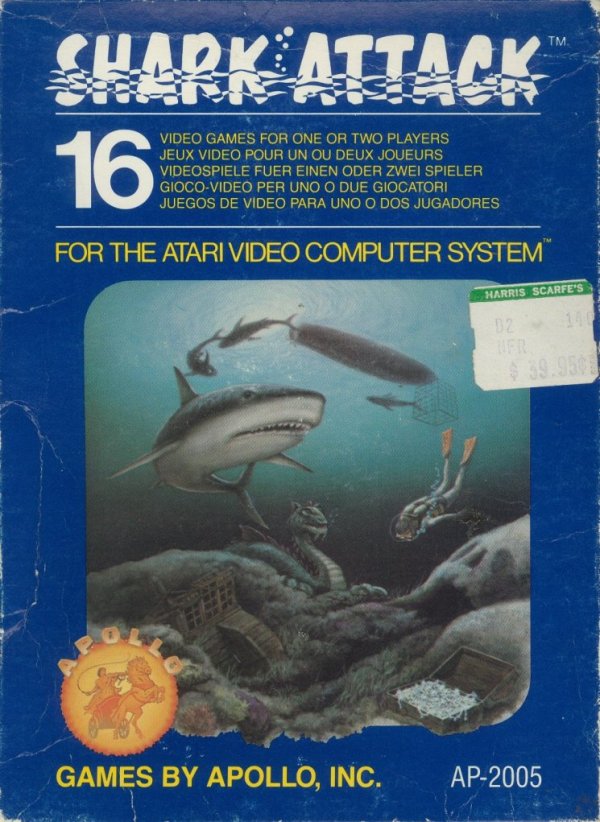 Shark Attack Boxes 1) no ©, dark blue box with fancy letters, illustration same as fancy letter version, Apollo address on front Front