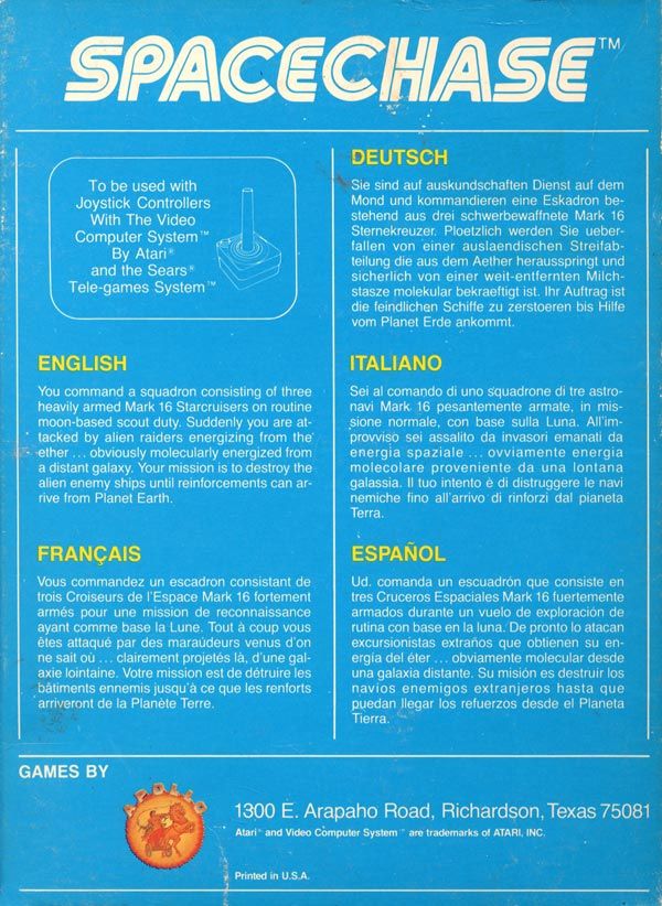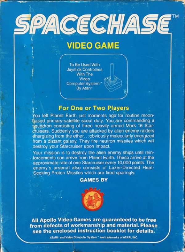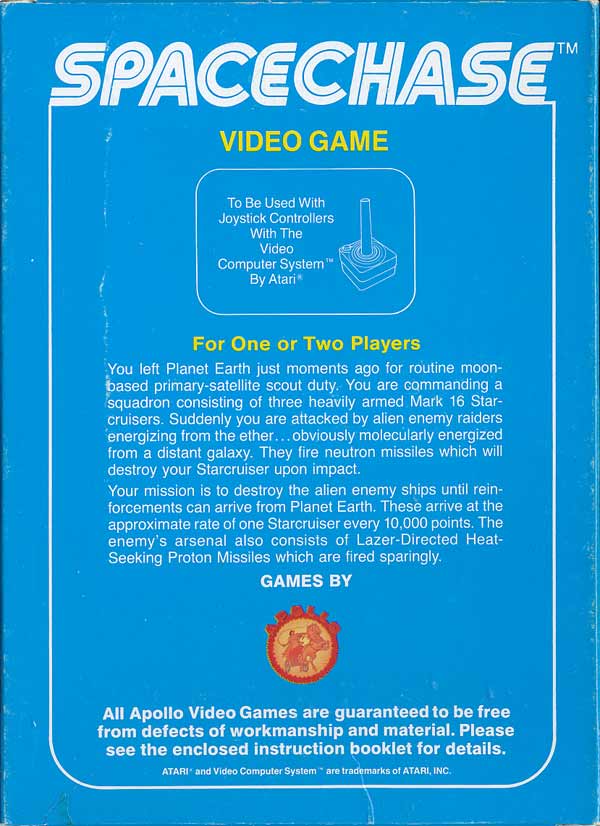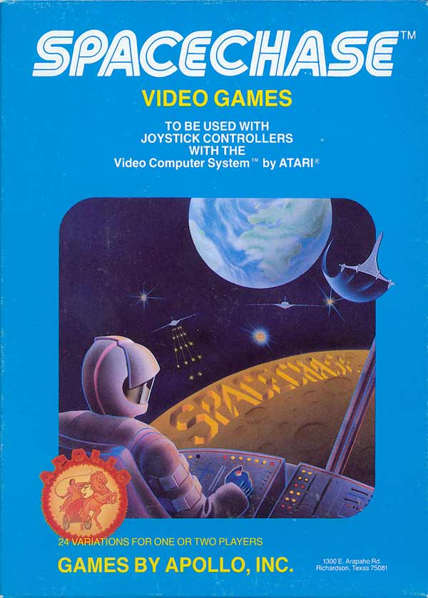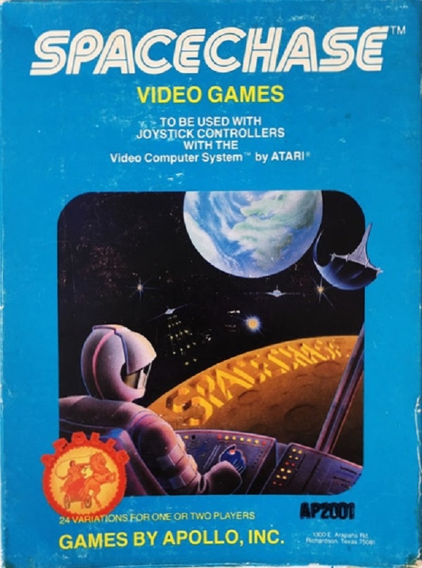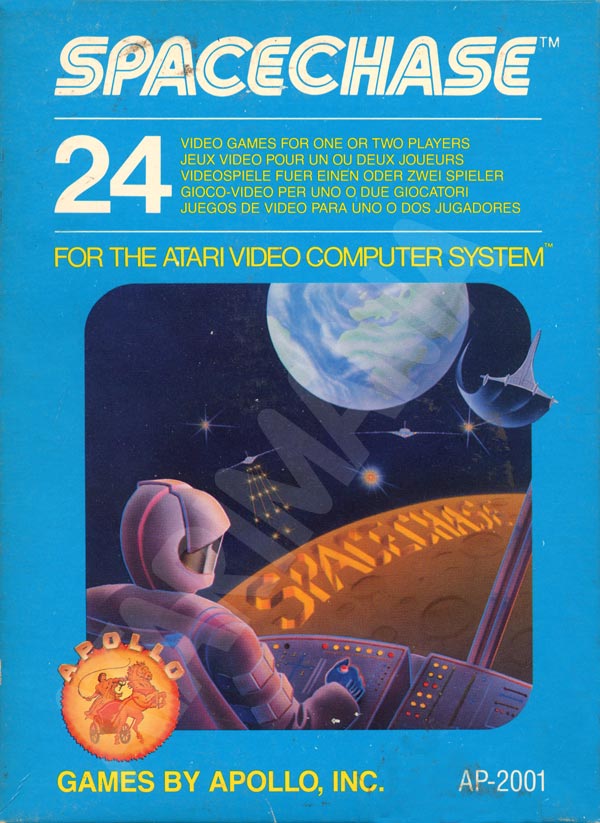 Spacechase Boxes 1) no ©, light blue box with fancy letters, illustration same as fancy letter version, Apollo address on front, no product # on box Front