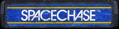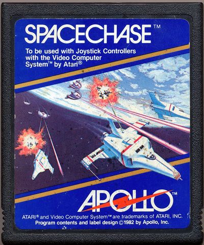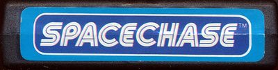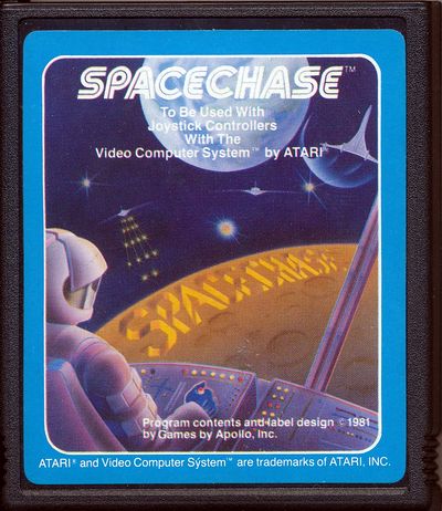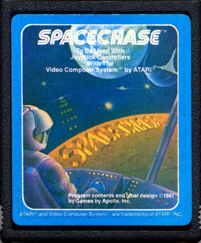 Spacechase Cartridges version a)* C ©1981, blue label, fancy letters, CART: molded large letters, square post, regular label, nose of space ship in upper right picture does not touch right border, 1 in 1981 below red frame of window, A in Atari does not touch planet, EL: light blue background behind title