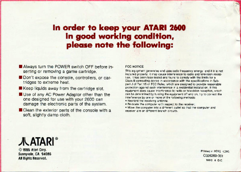 O15) ©1986, white, CO26260-001 on back, 4 pages, 5 x 7”, Printed in Hong Kong, no Rev, Atari 2600 (Jr model), “1990 4 G.C.” below product #