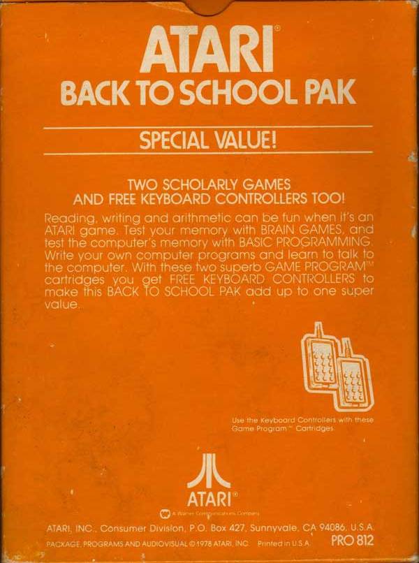 1) ©1978, orange outer box, contains generic white boxes of Brain Games, Basic Programming, and 2 Keyboard Controllers, Printed in USA