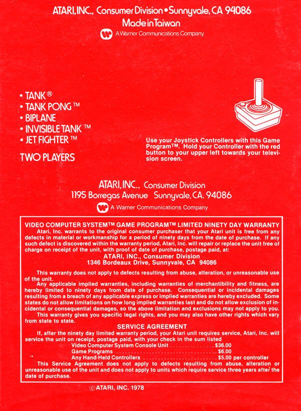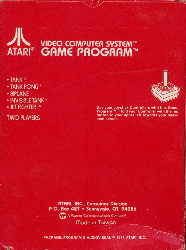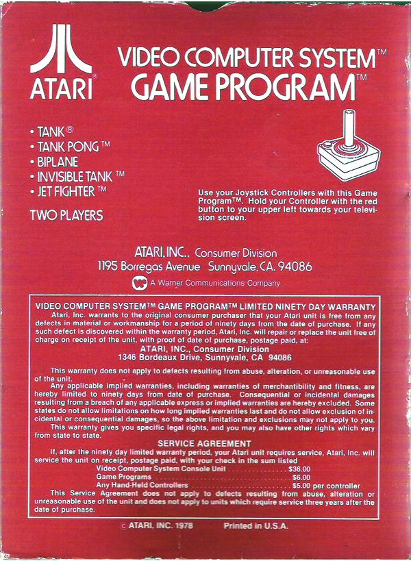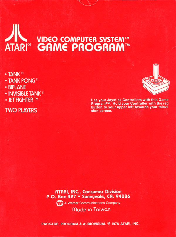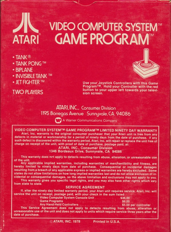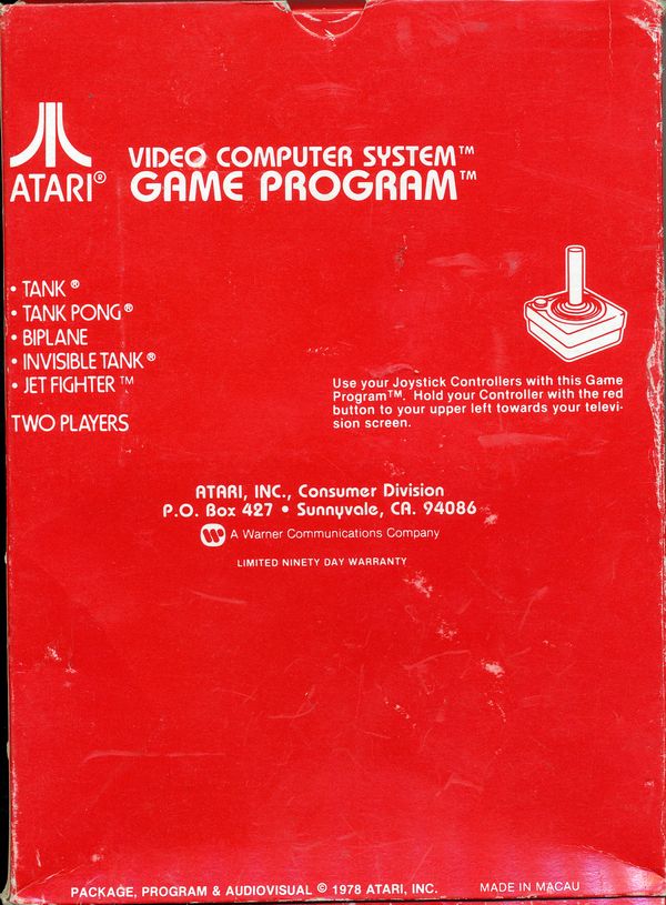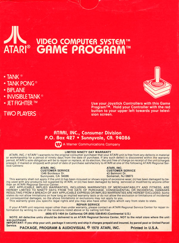 Back 6) ©1978, red box, red background warranty box, © outside warranty box, Printed in USA, ™ next to “TANK PONG” and “INVISIBLE TANK” on front of box, Rev 4 on flap, standard flap style, “Adpak San Francisco” 1/81, 3/81? on tiny flap Front