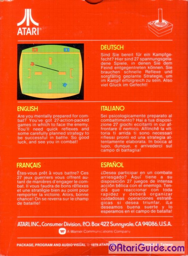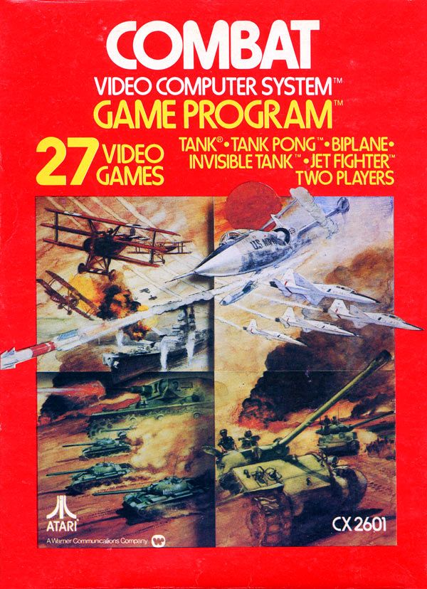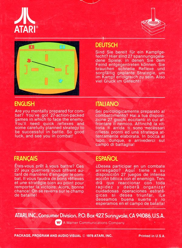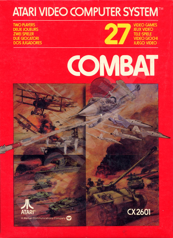 Combat Boxes 1) ©1977, red box, “combat 01” on side going up the box, front opening, no warranty box, instruction manual slot is vertical from top to bottom, small ® on Atari logo on back, box is super glossy, Printed in USA Front