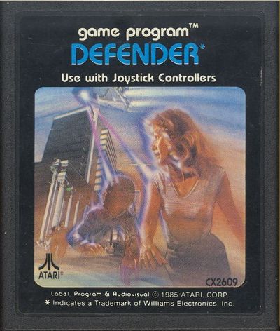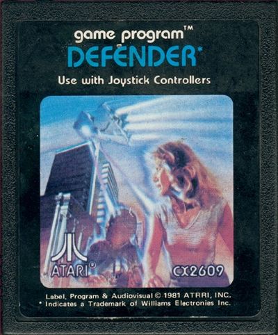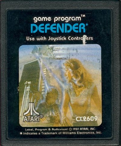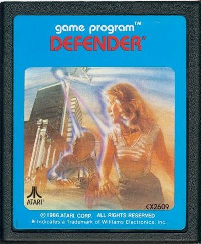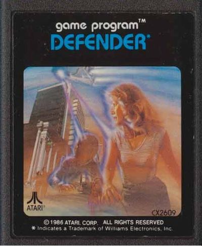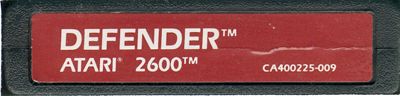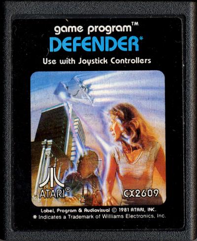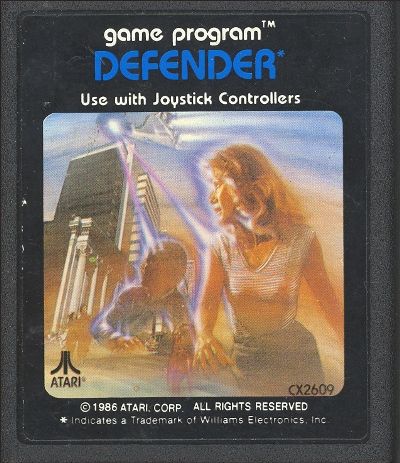 version h)* R PicBl ©1986, CART3, no “Use with…”, black Atari logo and “CX2609”, “Atari, Corp”, space ship’s top wing is cropped off , EL: dark blue “Defender” version i)* R PicBl ©1986, CART3, no “Use with…”, black Atari logo and “CX2609”, “Atari, Corp”, space ship’s top wing is cropped off , EL: regular blue “Defender”