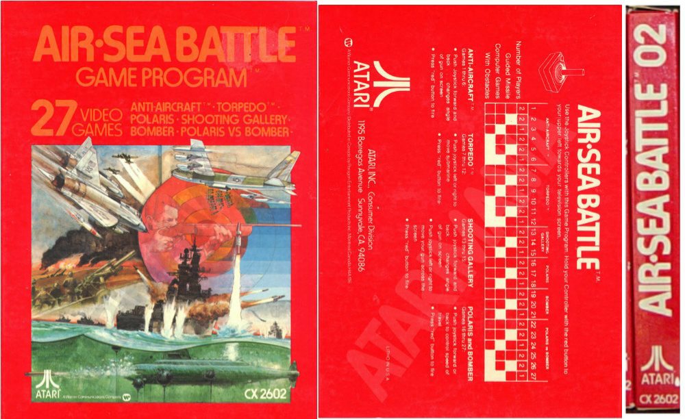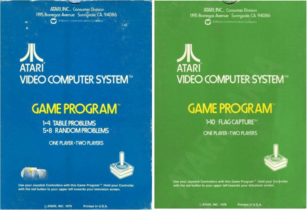Above we have the first released Atari games, which were in a gatefold book-style type of box. There were 9 released games with this style. Each of these had two digits after the title on the side of the box, representing the cartridge product number. No gatefold boxes have printers or print dates, though since the system and games were released in September, 1977, we can assume the boxes were printed at least 2 months earlier. The nine games are Air-Sea Battle, Basic Math, Black Jack, Combat, Indy 500, Star Ship, Street Racer, Surround, and Video Olympics.