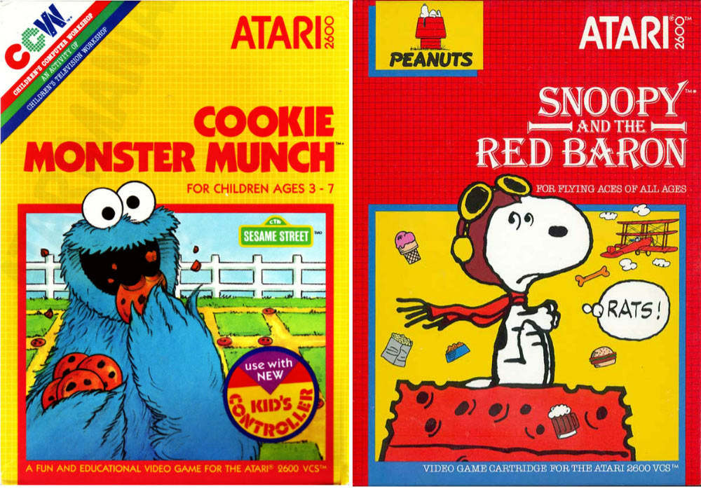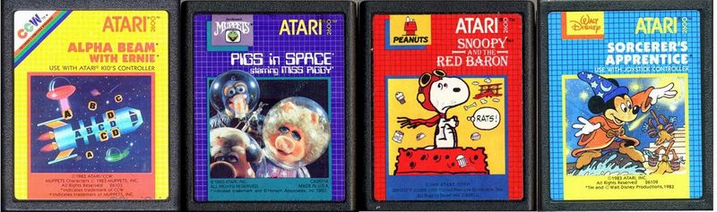 Above are the 4 different licensed labels. These were aimed at kids. Each one has a checkered background. The first is the Sesame Street games with the yellow label. There were four released in all. The purple label was designated for the Muppets. The only released game was the Pigs in Space shown. The red label is for the Peanuts license. The only released game was Snoopy and the Red Baron shown. The last cartridge is the blue label which was Disney. The only released game was Sorcerer's Apprentice shown, but there was a Snow White release of the prototype in a collector's edition of 250 numbered pieces.