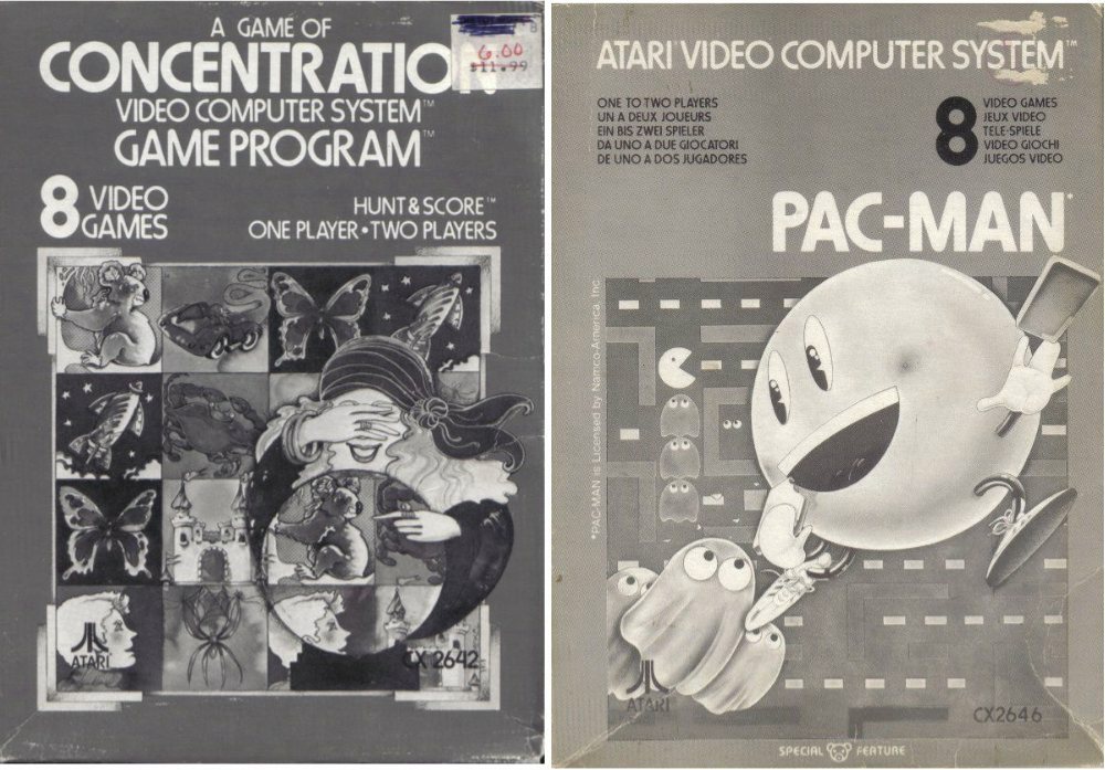 Atari later re-released games with different colored boxes from what were originally produced. The grey-tone box versions of these games are extremely popular. Printers include Kuang IH and MW. Printer dates range from August, 1986 to June, 1988. Confirmed grey-tone box games are A Game of Concentration, Basic Programming, Basketball, Black Jack, Bowling, Brain Games, Canyon Bomber, Codebreaker, Demons to Diamonds, Flag Capture, Fun with Numbers, Golf, Hangman (has color picture), Home Run, Maze Craze, Night Driver, Outlaw, Pac-Man, Realsports Volleyball, Surround, and Swordquest Earthworld.