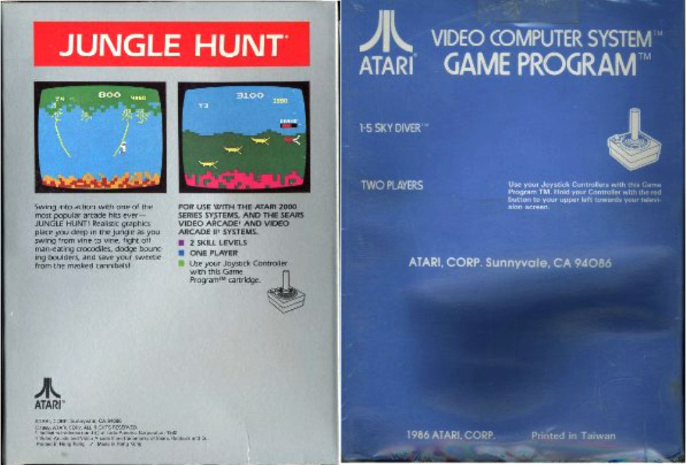 Besides the grey-tone boxes, there were many titles released under the Atari, Corporation or Atari, Corp. license that remained in their original color boxes. These boxes were English release only, no multi-languages. Most were released between 1985-1988. Printers include Faith Luck, Kuang IH, Valour, and WA-TA. Printer dates range from March, 1986 to August, 1988. No particular dates will be listed, but the following titles have been confirmed: 3-D Tic-Tac-Toe, Adventure, Air-Sea Battle, Asteroids, Backgammon, Battlezone, Casino, Combat, Crystal Castles, Dig Dug, Dodge 'Em, Indy 500, Jungle Hunt, Krull, Math Gran Prix, Millipede, Othello, Pac-Man, Pole Position, Realsports Baseball, Realsports Football, Realsports Tennis, Sky Diver, Sorcerer's Apprentice, Stargate, Star Raiders, Taz, and Video Checkers.