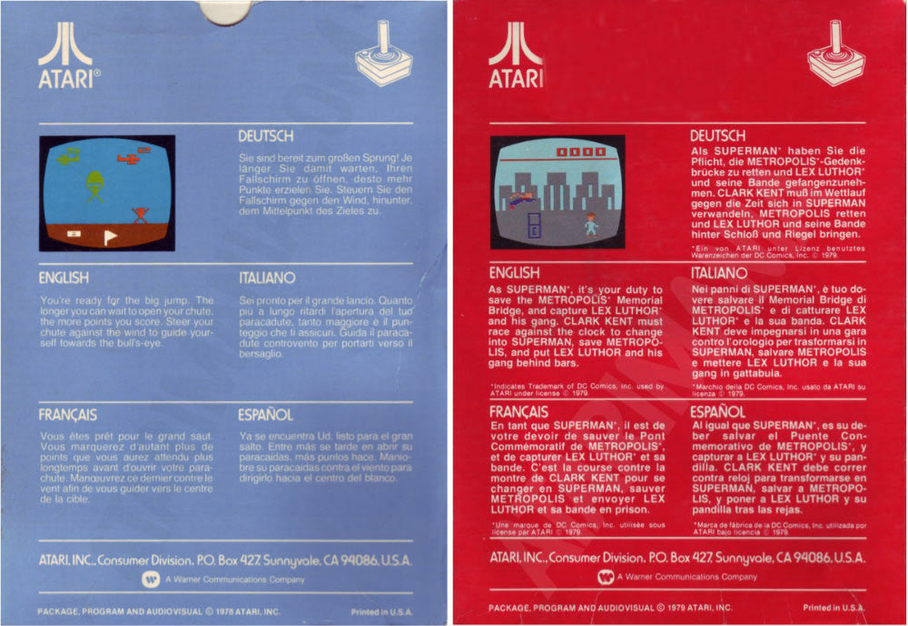 Many titles were released with multi-language formats on the box. We're breaking the lists down to some specifics. This first area are games released with 5 languages on the box with the original year of release of the game. Printers include Adpak San Francisco and Shorewood Packaging. Printer dates include October, 1981 and July, 1982. The confirmed games are 3-D Tic-Tac-Toe, Adventure, Air-Sea Battle, Asteroids (1979), Backgammon, Basic Programming, Basketball, Bowling, Brain Games, Breakout, Casino, Circus Atari, Combat, Defender, Demons to Diamonds, Desert Falcon, Dodge 'Em, Hangman, Haunted House, Home Run, Human Cannonball, Indy 500, Math Gran Prix, Maze Craze, Missile Command, Night Driver, Othello, Outlaw, Pac-Man, Pele's Soccer, Q*Bert, Sky Diver, Space Invaders, Star Raiders, Street Racer, Super Breakout, Superman, Video Checkers, Video Chess, Video Olympics, and Yars' Revenge.