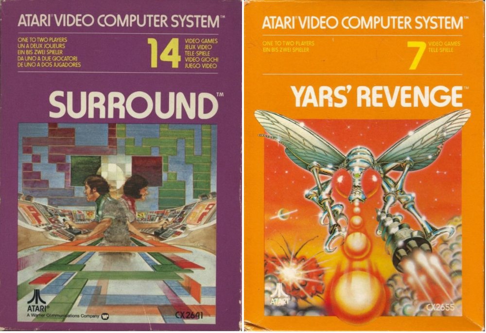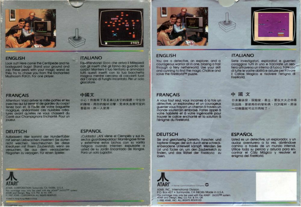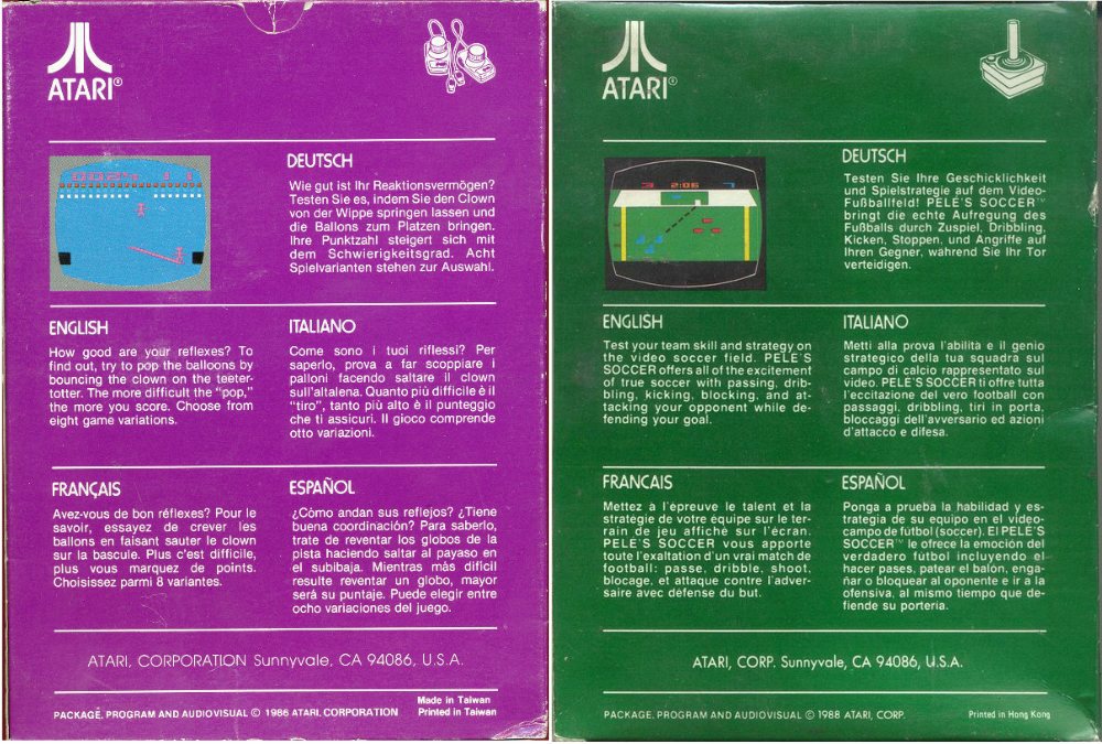 There were a few titles that had the box variation with 5 languages that were released some years after the original year of release. Confirmed games are Circus Atari, Defender, Missile Command, Pac-Man, Pele's Soccer, Space Invaders, Super Breakout, and Swordquest Earthworld.