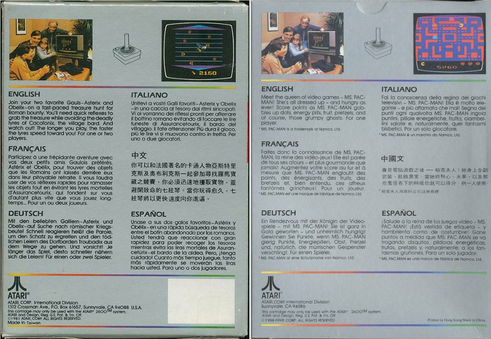 There were also several titles that had the box variation with 6 languages that were released some years after the original year of release. Confirmed games are Asterix, Battlezone, Centipede, Dig Dug, Galaxian, Kangaroo, Mario Bros., Moon Patrol, Ms. Pac-Man, Phoenix, Realsports Soccer, Realsports Tennis, Realsports Volleyball, Snoopy and the Red Baron, and Vanguard.