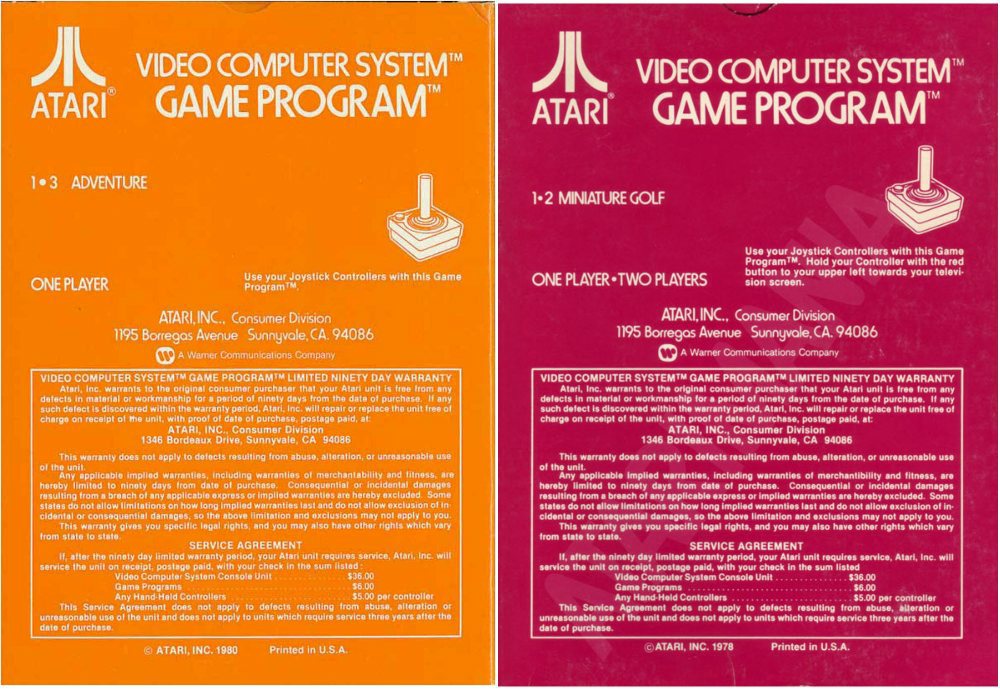 The last regular box release is the “limited ninety day warranty” on the back with no real warranty box. I believe that Atari didn't want to print the huge warranty any longer, which cost more in ink. Printers include no printer (Combat Macau), Adpak San Francisco, Bertco Graphics, Ivy Hill, Shorewood Packaging, and hop. Printer dates on these boxes range from October, 1981 through June, 1984. All of these boxes have Rev 3 on the flaps. There are four exceptions: Combat Rev 2 (Macau), Space War Rev 1, Super Breakout Rev 2, and Surround Rev 1. These four boxes did not have any of the three previously described boxes except for Combat, and thus may have been the next revision from their perspective original boxes. Confirmed Rev 3 games are Adventure, Backgammon, Basketball, Brain Games, Breakout, Canyon Bomber, Casino, Circus Atari, Football, Hangman, Home Run, Human Cannonball, Indy 500, Maze Craze, Missile Command, Night Driver, Othello, Street Racer, Superman, Video Checkers, Video Chess, Video Olympics, Video Pinball, and Warlords. Unconfirmed Rev are 3-D Tic-Tac-Toe, Air-Sea Battle, Bowling, Dodge 'Em, Golf, Sky Diver, Slot Racers, and Space Invaders.