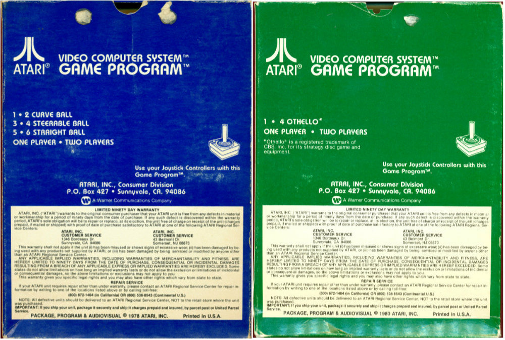 The next release we think is the white background warranty box on the back with the copyright date inside the warranty box. The system repair charge has been removed from inside the warranty box. These all have Rev 2 on the flaps. They are also dated between 1978-1980. Printers include no printer (Othello), Adpak San Francisco, Bertco Graphics, and Ivy Hill. Printer dates range from May to October, 1981. Confirmed games are 3-D Tic-Tac-Toe, Adventure, Air-Sea Battle, Asteroids (1981), Backgammon, Basic Programming, Bowling, Circus Atari, Combat (Rev 1), Dodge 'Em, Golf, Home Run, Indy 500, Missile Command, Night Driver, Othello, Outlaw, Pele's Soccer, Slot Racers, Space Invaders, Street Racer, Super Breakout (Rev 1), Superman, Video Checkers, Video Olympics, Video Pinball, and Warlords. Unconfirmed Rev are Brain Games, Breakout, Canyon Bomber, Codebreaker, and Maze Craze.
