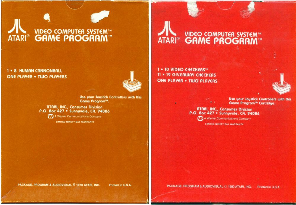 We believe the third release boxes were ones that had a warranty box on the back, and the background of the warranty box was the same color as the box. The copyright date is outside below the warranty box and there is a repair charge for the system for $36 inside the box. We discovered about half of these have Rev 1, and the other half have Rev 4. Slot Machine has only one known box release and it has a Rev 4 on the flap. These games all have dates from 1978-1980. Printers include no printer (Combat), Adpak San Francisco and Bertco Graphics. Printer dates include no date (Bowling, Casino, Combat, Football, Space Invaders, and Video Chess) and range from November, 1978 to January, 1982. Rev 1 confirmed games are 3-D Tic-Tac-Toe, Adventure, Backgammon, Basic Programming, Championship Soccer, Circus Atari, Dodge 'Em, Golf, Maze Craze, Night Driver, Othello, Space Invaders (Rev 1 and 2 versions exist), Superman, Video Chess, and Video Pinball. Rev 4 confirmed games are Air-Sea Battle, Basketball, Bowling, Breakout, Canyon Bomber, Casino, Combat, Football, Home Run, Human Cannonball, Indy 500, Miniature Golf, Sky Diver, Slot Machine, and Street Racer. Unconfirmed Rev are A Game of Concentration, Fun with Numbers, Hangman, Outlaw, Video Checkers, and Video Olympics.