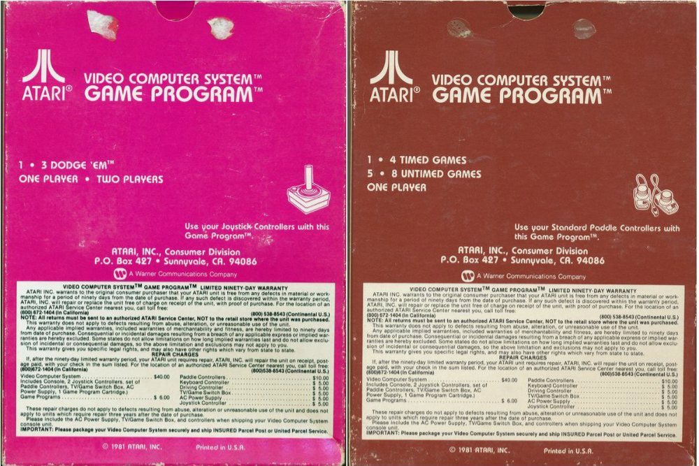 The next regular boxes that were most likely released were all dated 1981. All of these have Rev 1 on the flaps. They have white warranty boxes with the copyright date outside the warranty box and the system repair charge has increased to $40. Even though they are Rev 1, we think this is a later release due to the 1981 date. Printers include Bertco Graphics and Ivy Hill. All printer dates have fallen between March to May, 1981. The majority of these titles were originally released in 1977-1978. Confirmed games are Adventure (Rev ?), Air-Sea Battle, Asteroids, Basketball, Bowling, Breakout, Circus Atari, Dodge 'Em, Football, Golf, Missile Command, Night Driver, Outlaw (Rev?), Pele's Soccer (Rev ?), Slot Racers (Rev ?), Space Invaders (Rev ?), Street Racer (Rev ?), Superman, and Warlords.