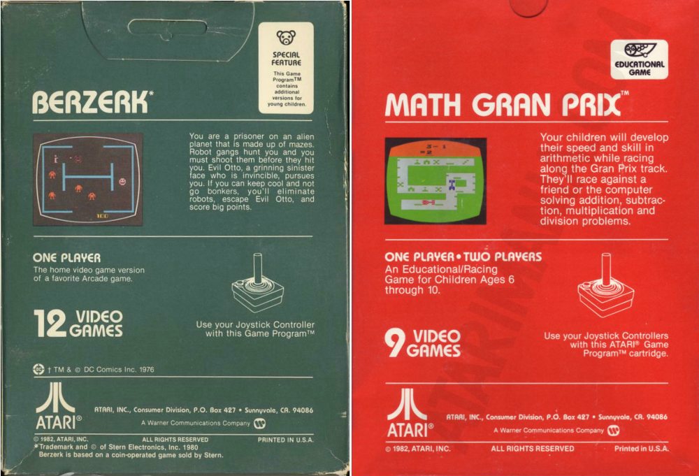 Before the silver labels were released, in 1981-1982, 8 games were released that did not fit into any of the categories above. These came in colored boxes. Printers include Adpak San Francisco, Bertco Graphics, Shorewood Packaging, and Ivy Hill. Printer dates range from January to August, 1982 and include August, 1983 for Pac-Man. The titles are Berzerk, Defender, Demons to Diamonds, Haunted House, Math Gran Prix, Pac-Man, Star Raiders, and Yars' Revenge.